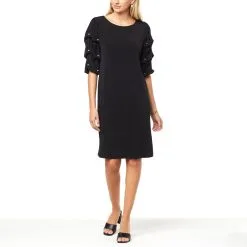 Antthony Faux Pearl-Trimmed Tiered Sleeve Sheath Dress Antthony’s flattering knit sheath dress is framed by tiered puff sleeves with faux pearl accents for a elegantly dramatic touch.