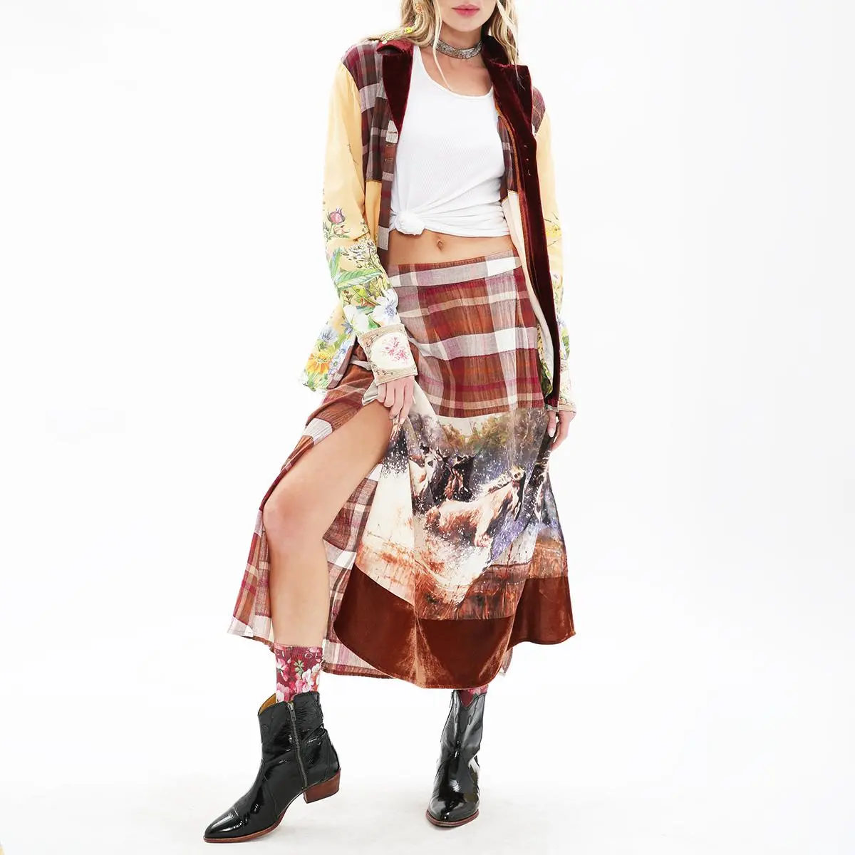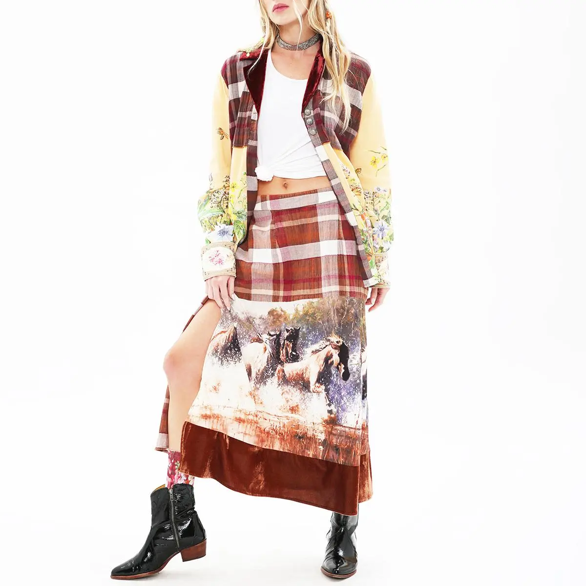 Aratta In The Saddle Maxi Shirt This elegant loose fitted blouse is perfect for any season. It features a vintage embroidery and much style and pizzazz. Plaid maxi skirt with horses print in the front, Pockets Shell: 100% Cotton, Cont. 1: 100% Polyester, Cont. 2: 93% Polyester, 7% Spandex Imported
