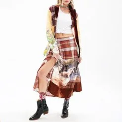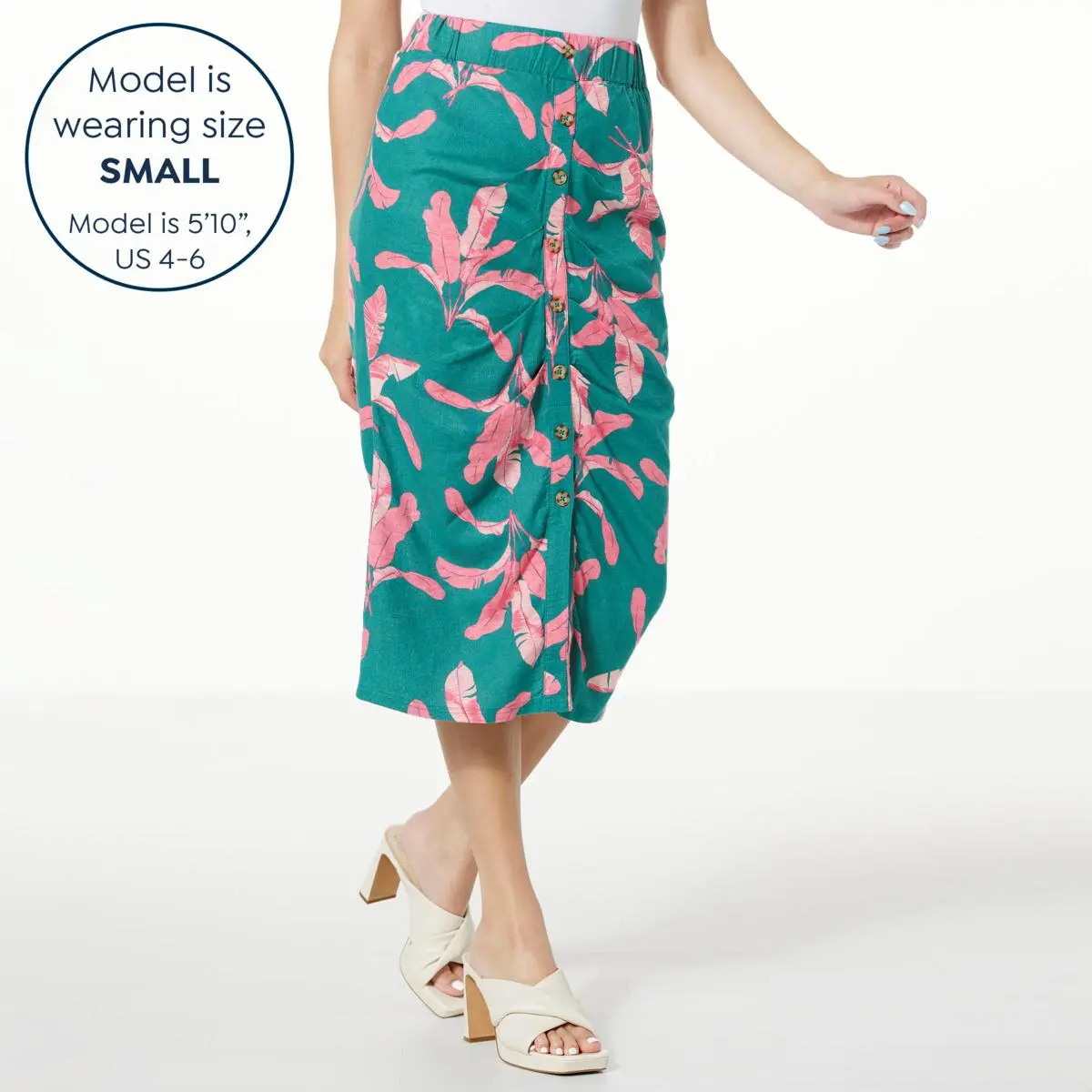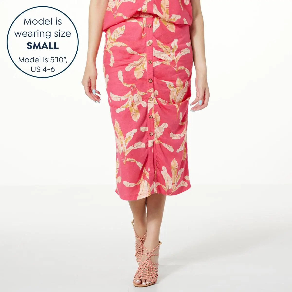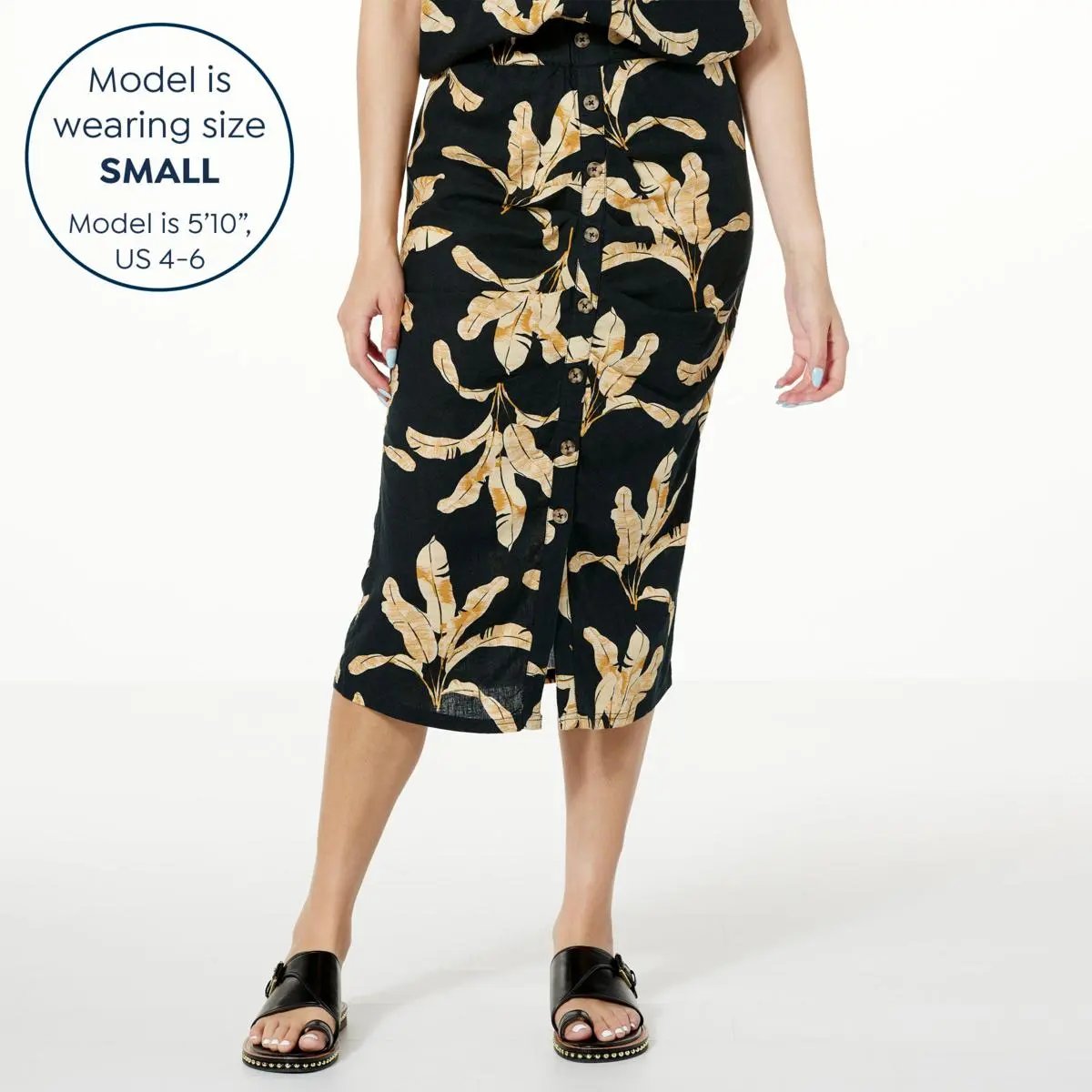 | Skirt Type | Pencil with pleated front; decorative/non-functional button trim on center front |