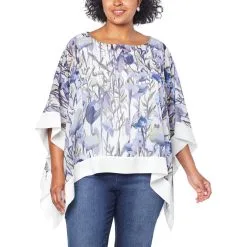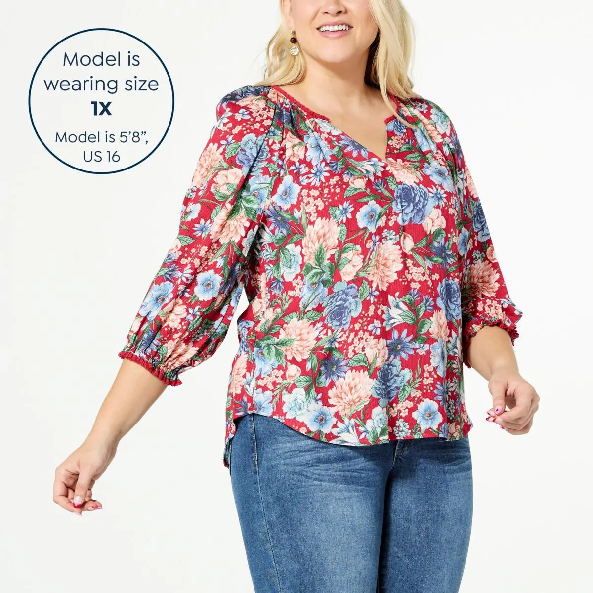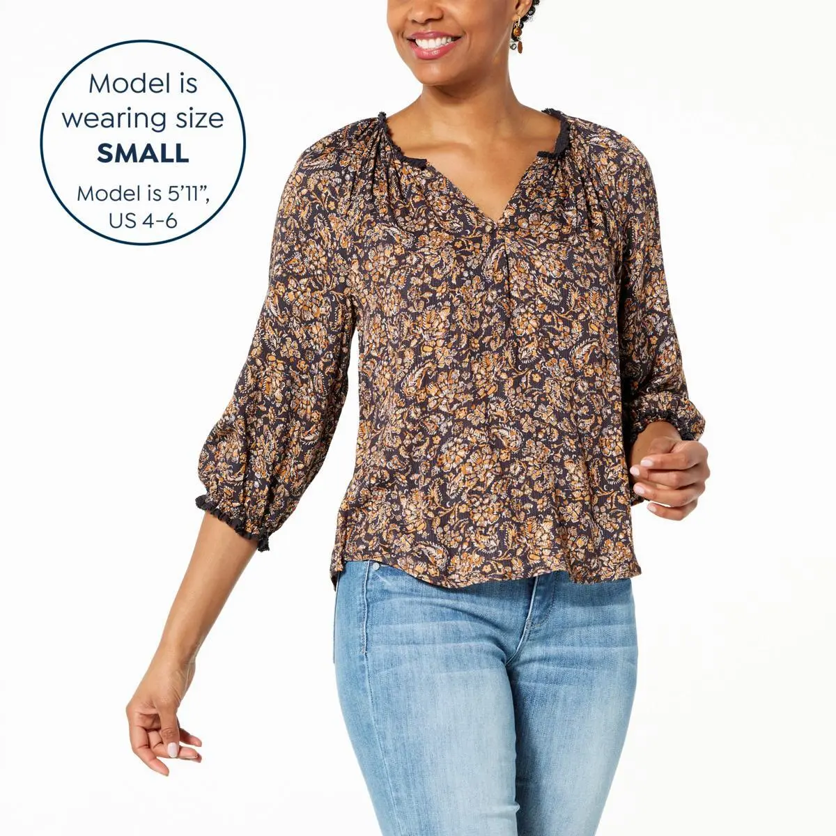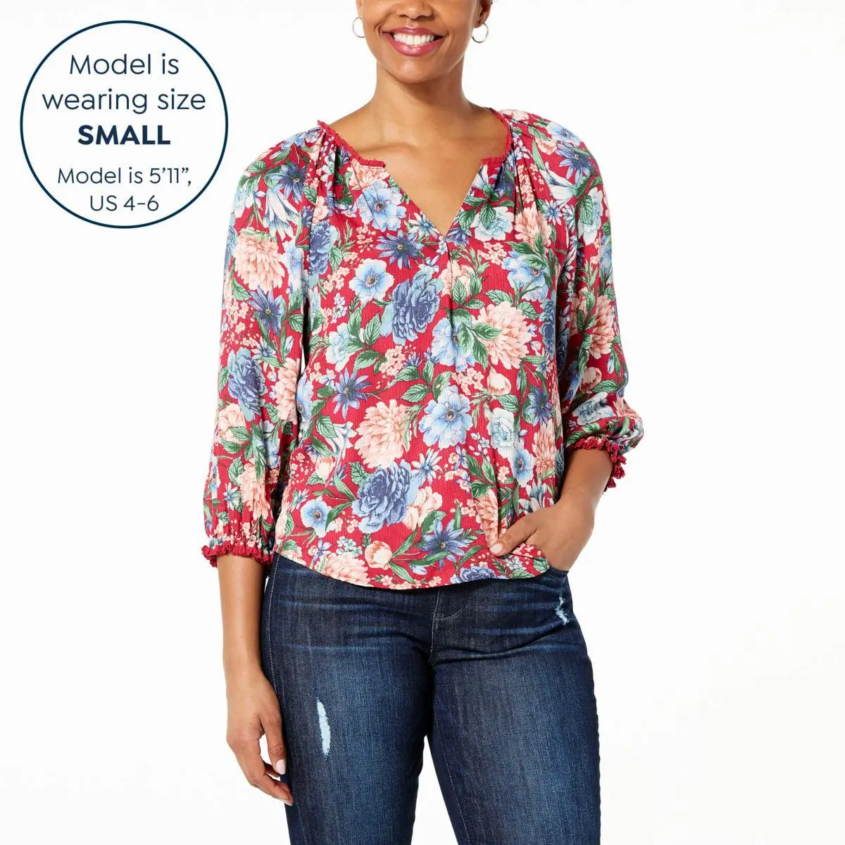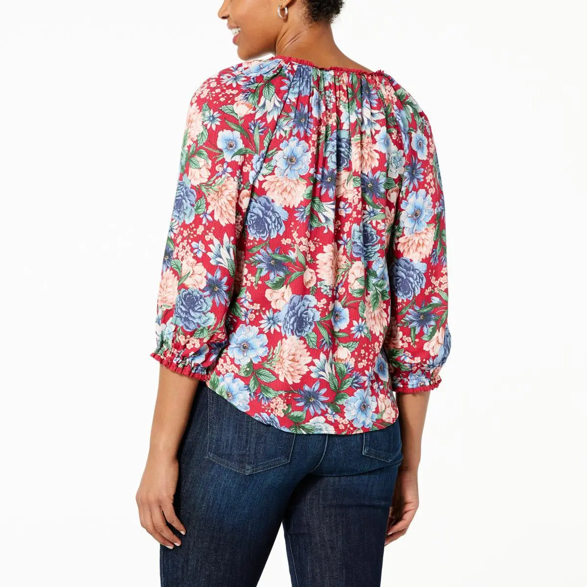 Democracy Printed Woven Ruffle-Trim Peasant Top With its loose and flowy fit, this printed top finds the right balance between Boho and chic. Crocheted ruffle trim adds feminine appeal to the front and back neckline that’s easy to elevate when you blouse-out the top tucked into fitted bottoms. Or, leave it untucked and let the breezy shirttail hem give a carefree vibe.