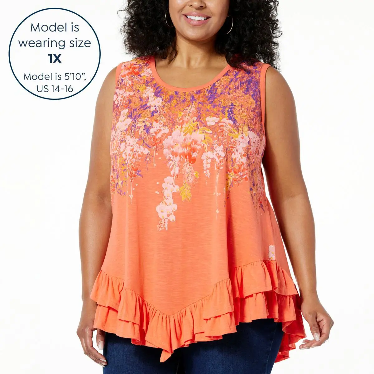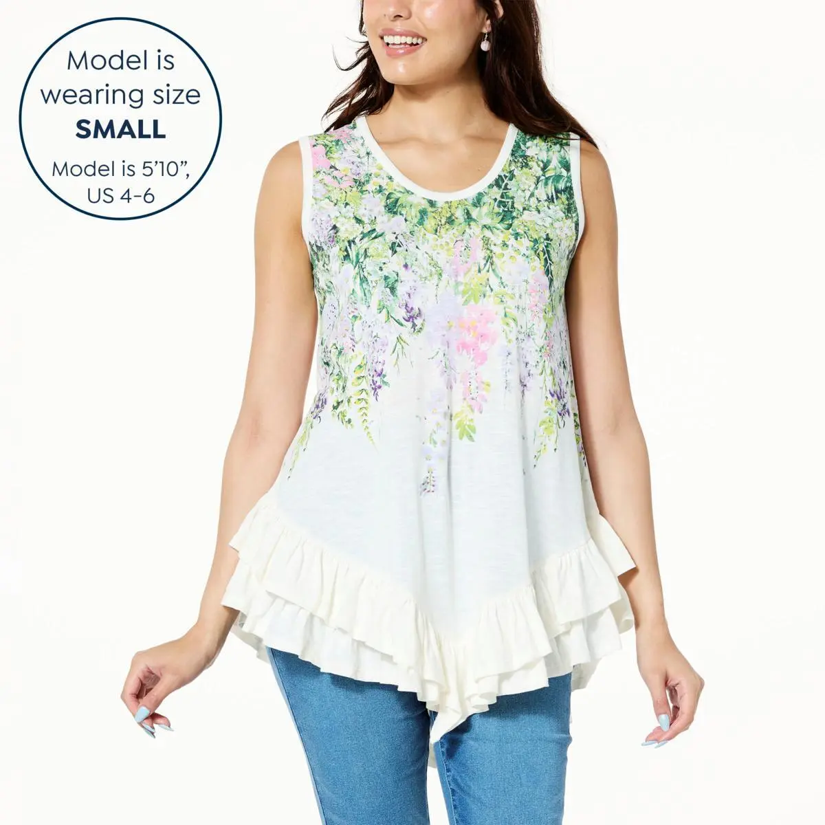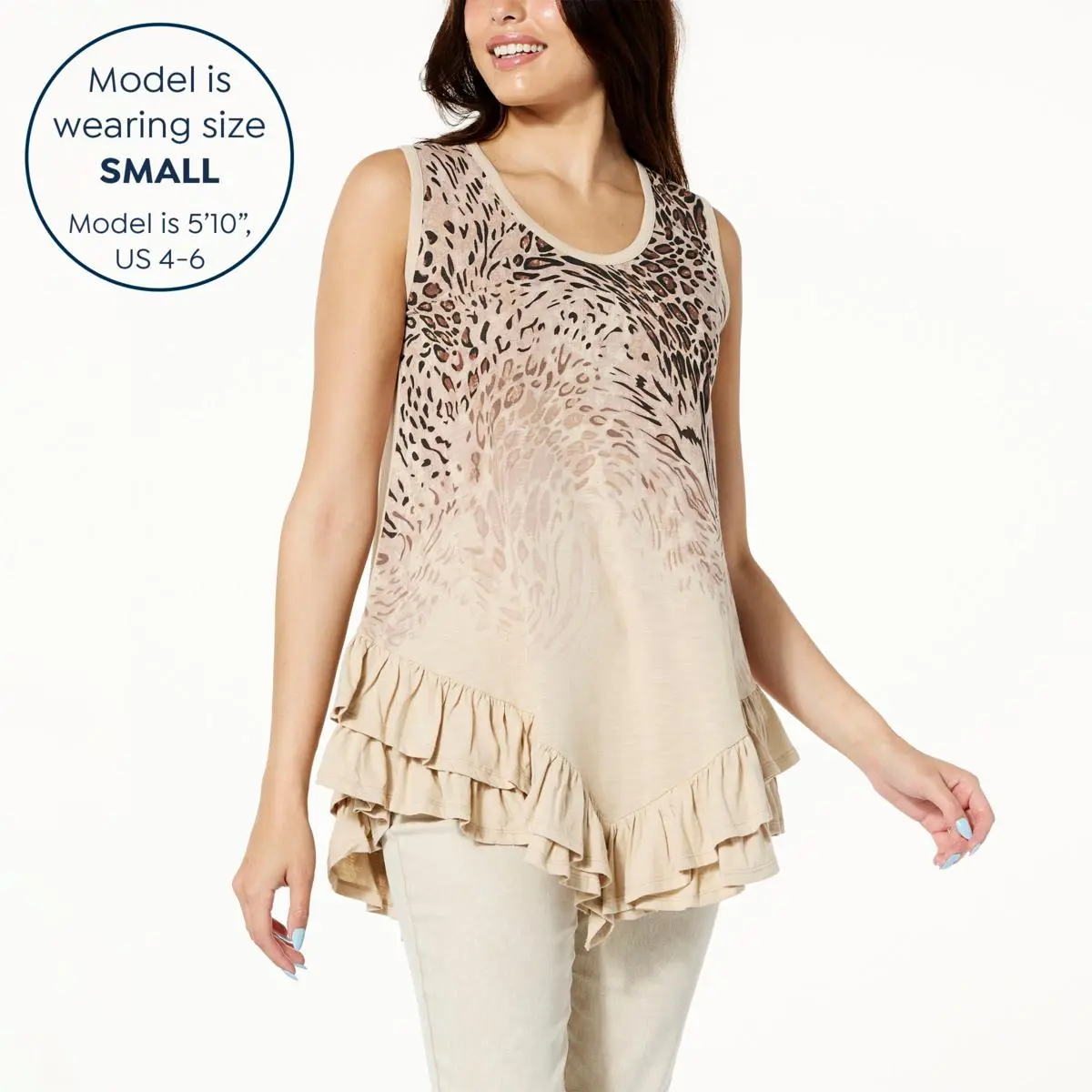 DG2 by Diane Gilman Print Slub Knit Ruffled-Hem Tank  Tiered ruffles at the hem give this classic print tank a super-sweet edge that looks good paired with any of your warm-weather bottoms.