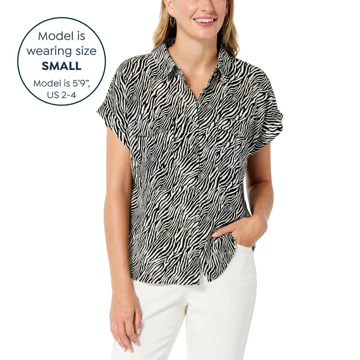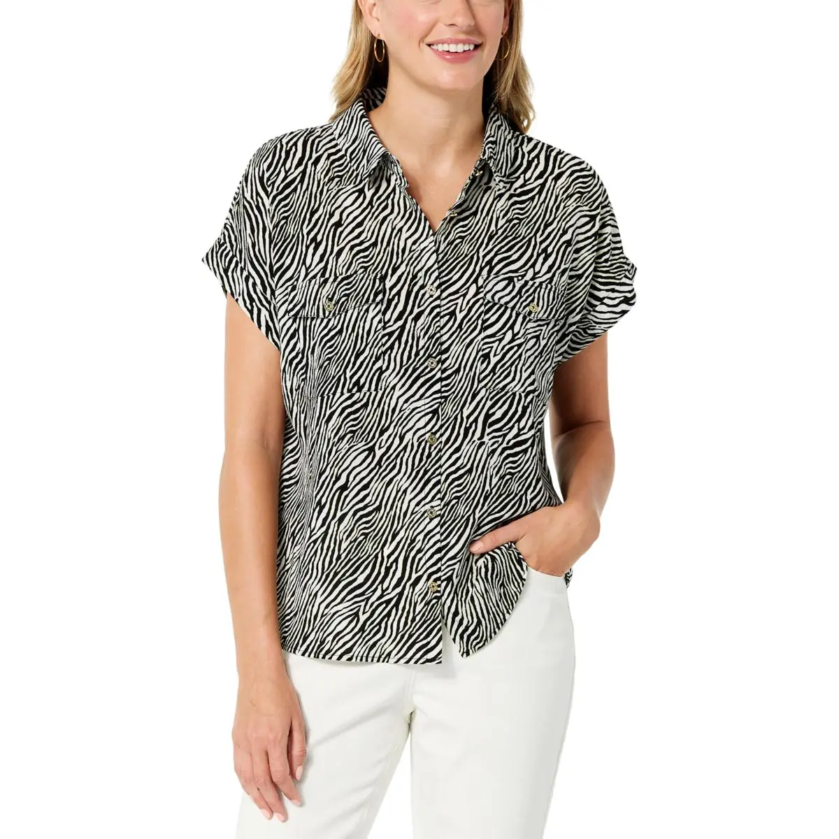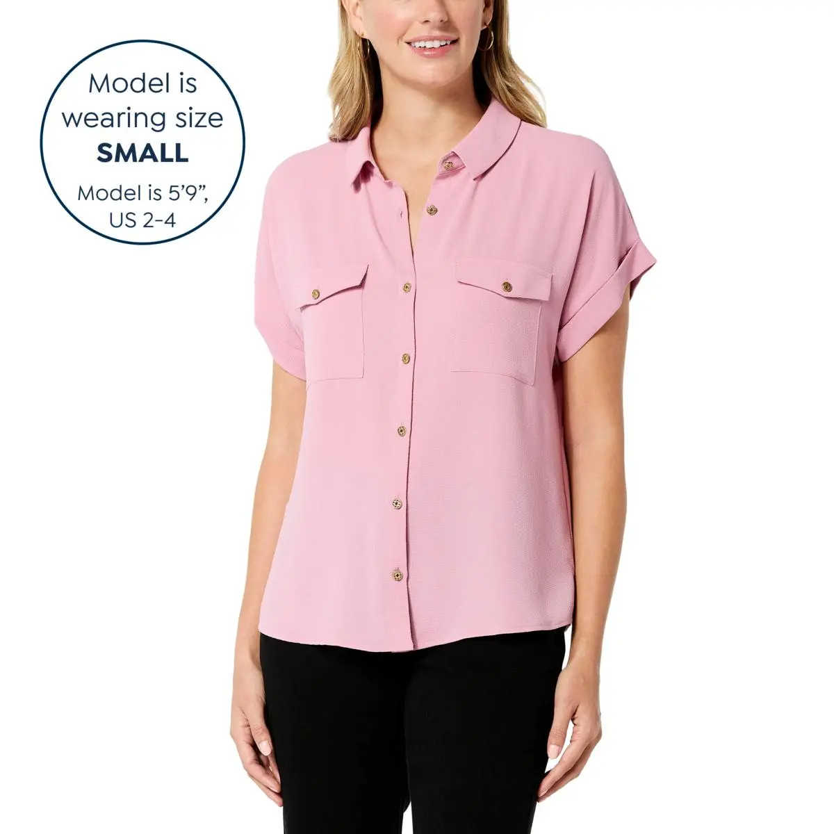 Jaclyn Smith Short-Sleeve Cuffed Button-Front Shirt You’ll love the chic sophistication of this short sleeve button-down shirt, and how it pairs perfectly with denim or your favorite pencil skirt.