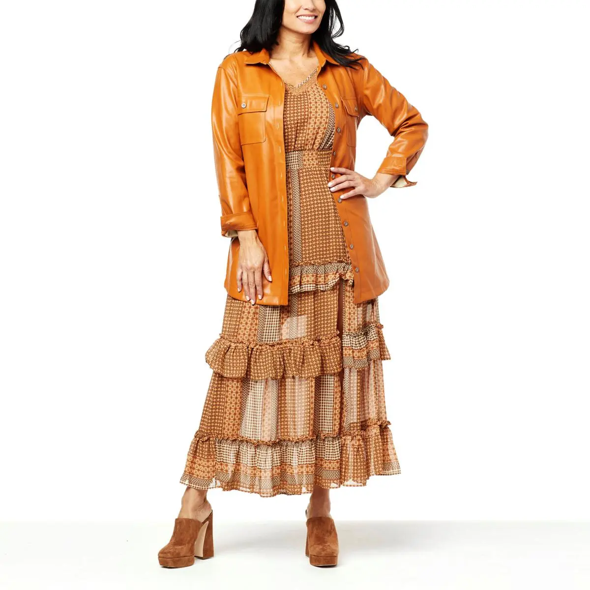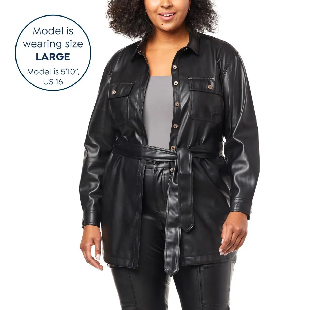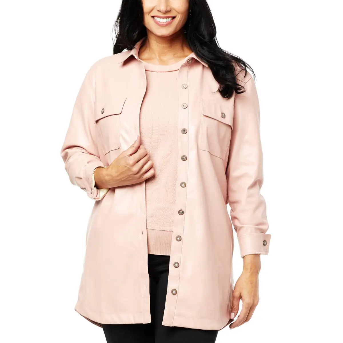 Jessica Simpson Paula Faux Leather Shacket You’ll love the versatility of this faux leather shirt/jacket. Wear it open over tee and jeans for a casual-chic look, or buttoned and belted with heels for an edgy look.