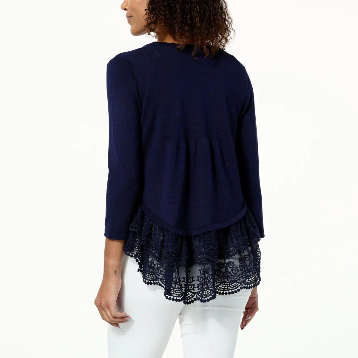 Nina Leonard Open-Front Bolero with Lace Trim Layer your staples with a bolero for ease and effortlessness. Designed with lace-trimmed detail at the back, this topper elevates your look with elegance.