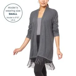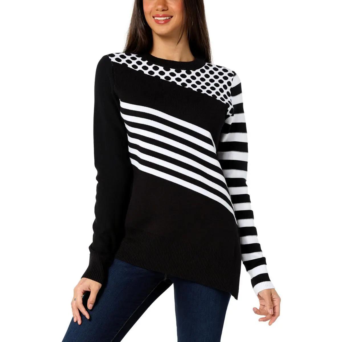 | Hemline | Asymmetric split hem, ribbed knit |