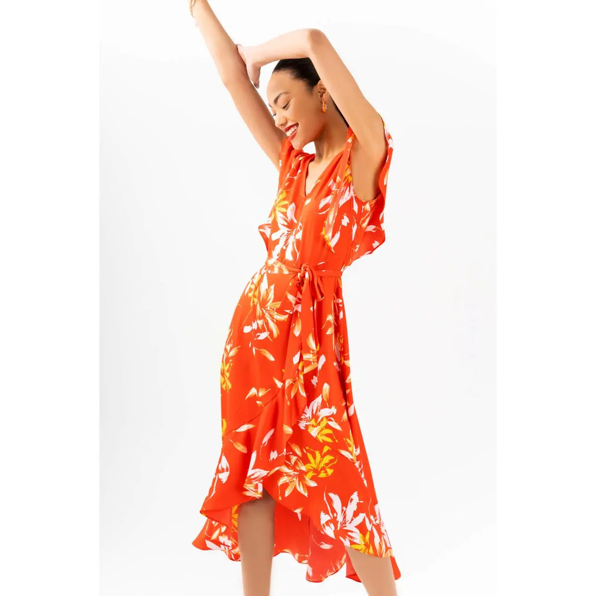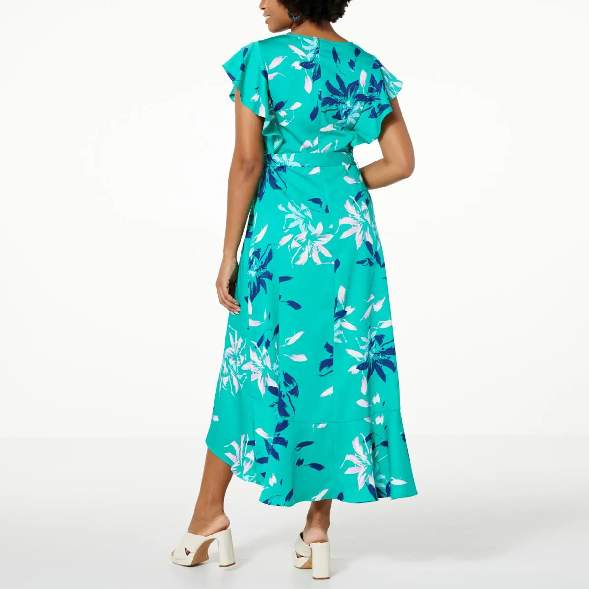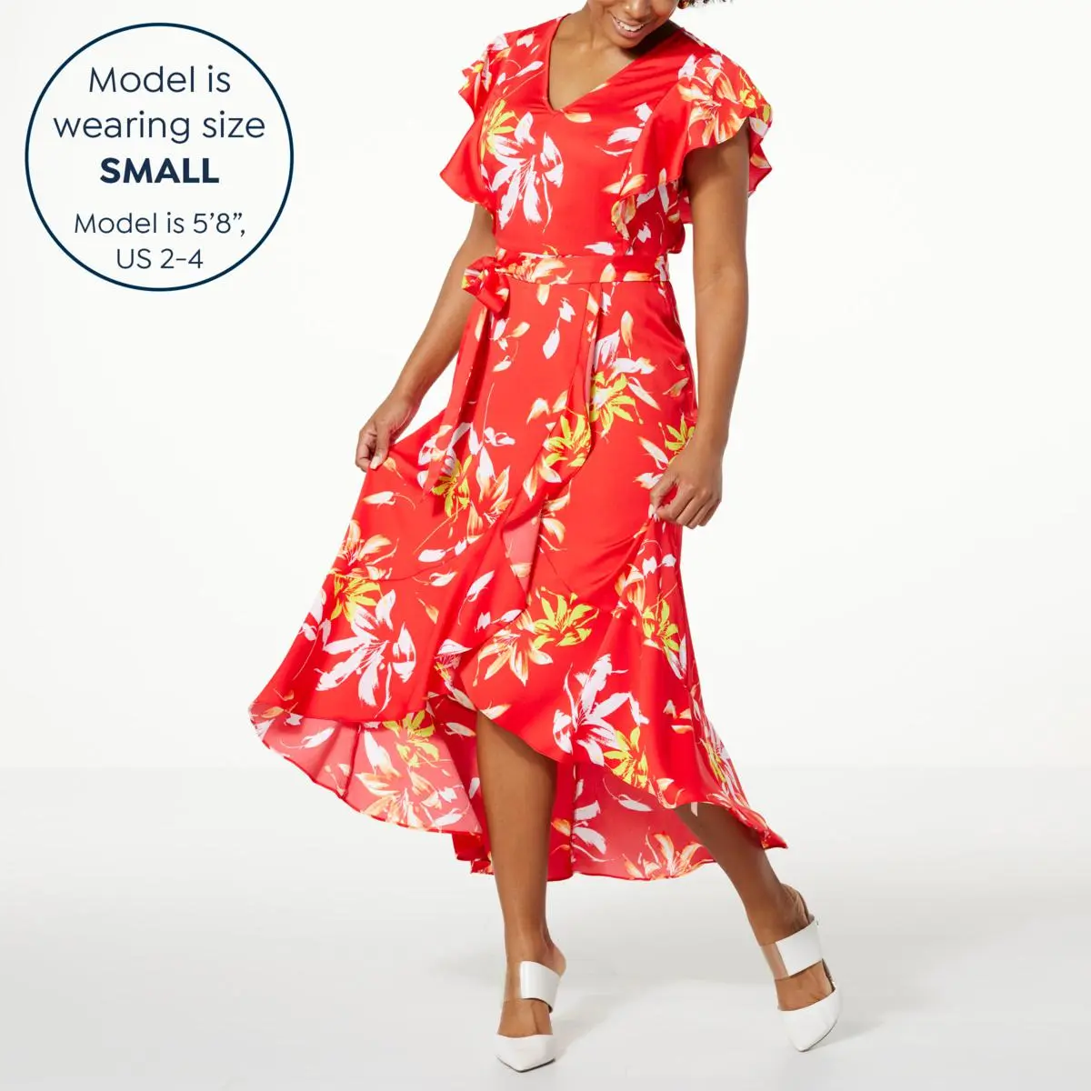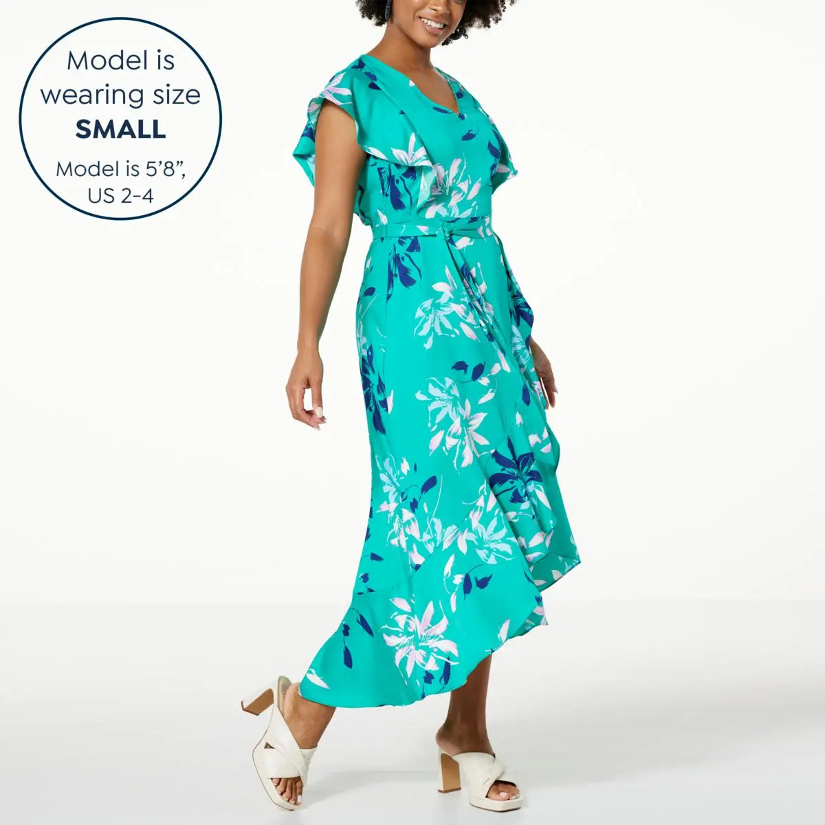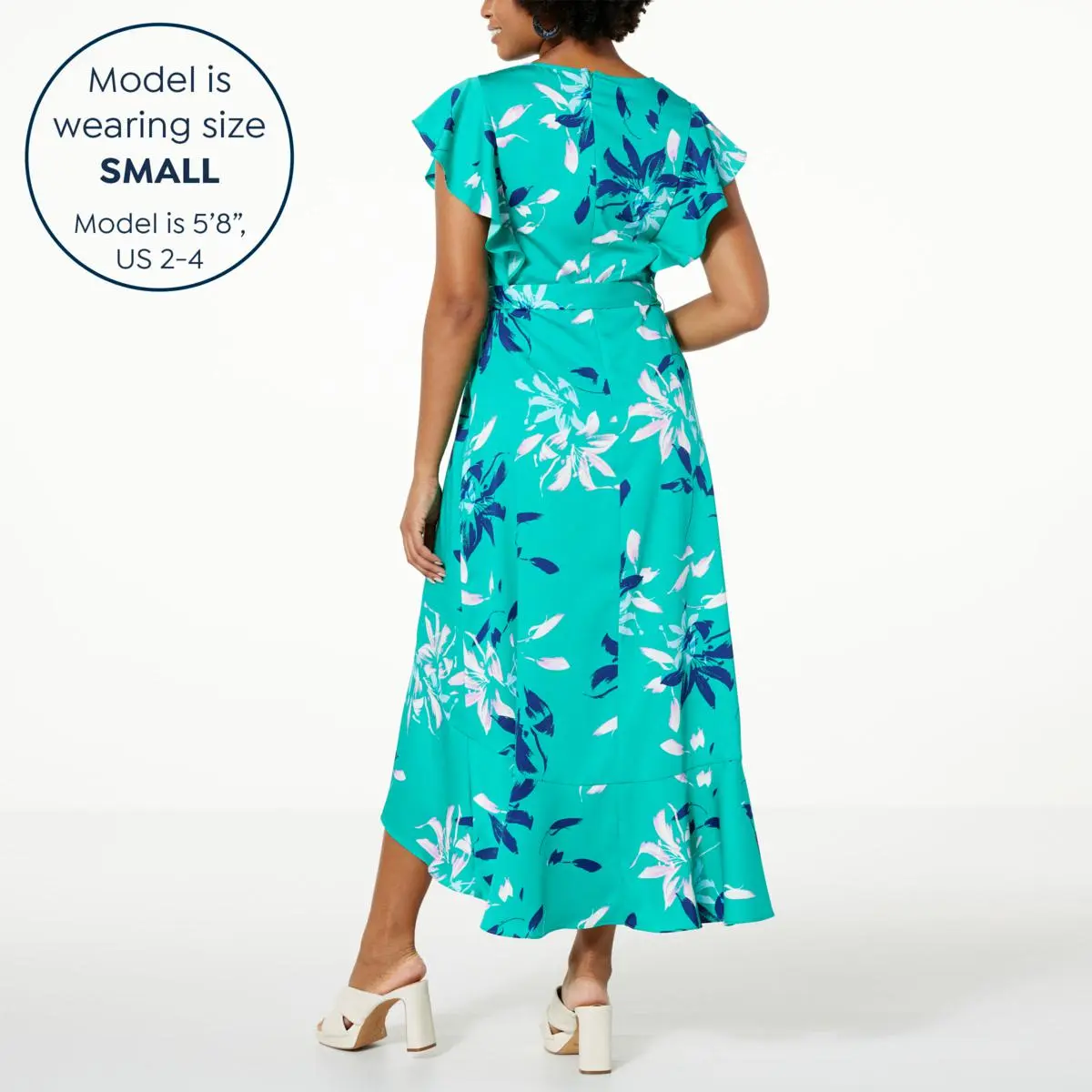 | Design Features | Back zipper, faux wrap front, ruffle detail |