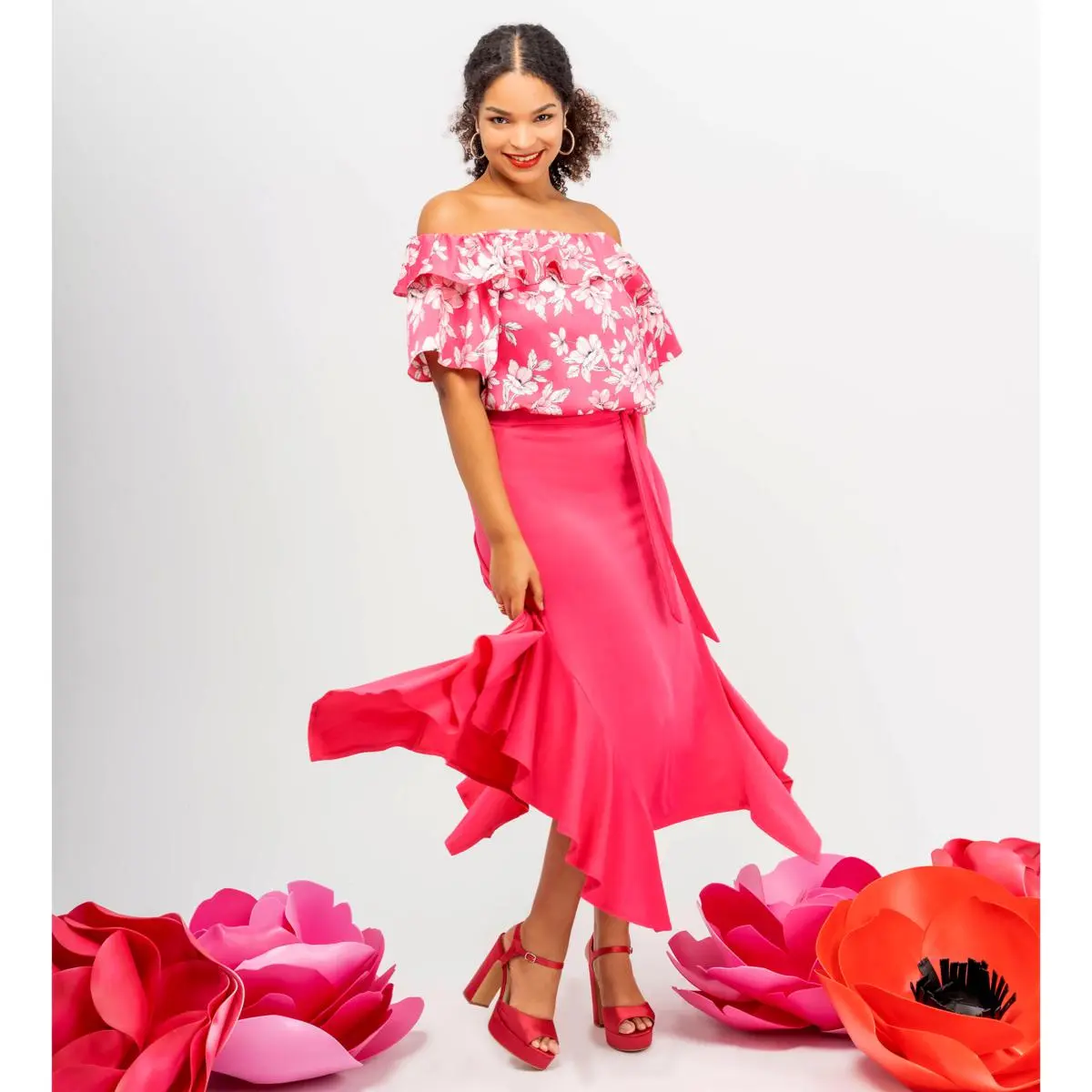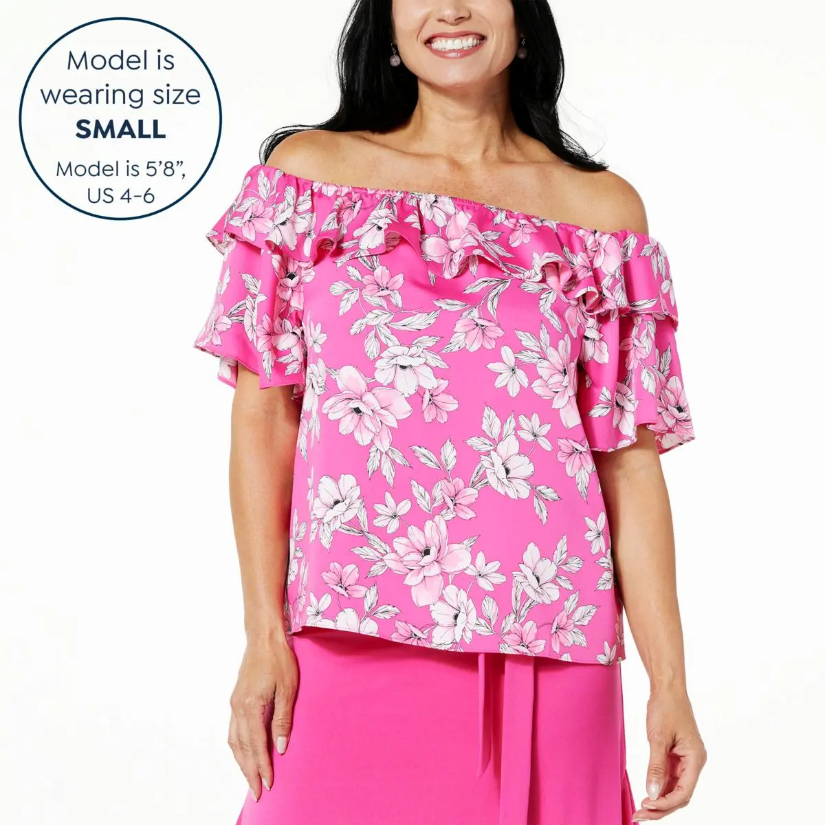 | Design Features | Exposed shoulders; ruffle detail |