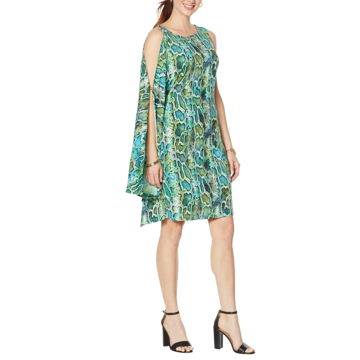 | Sleeves | Sleeveless on one side; half sleeve on the other side features peek-a-boo shoulder cutouts with goldtone metal beads and an extra-long, draped side panel |