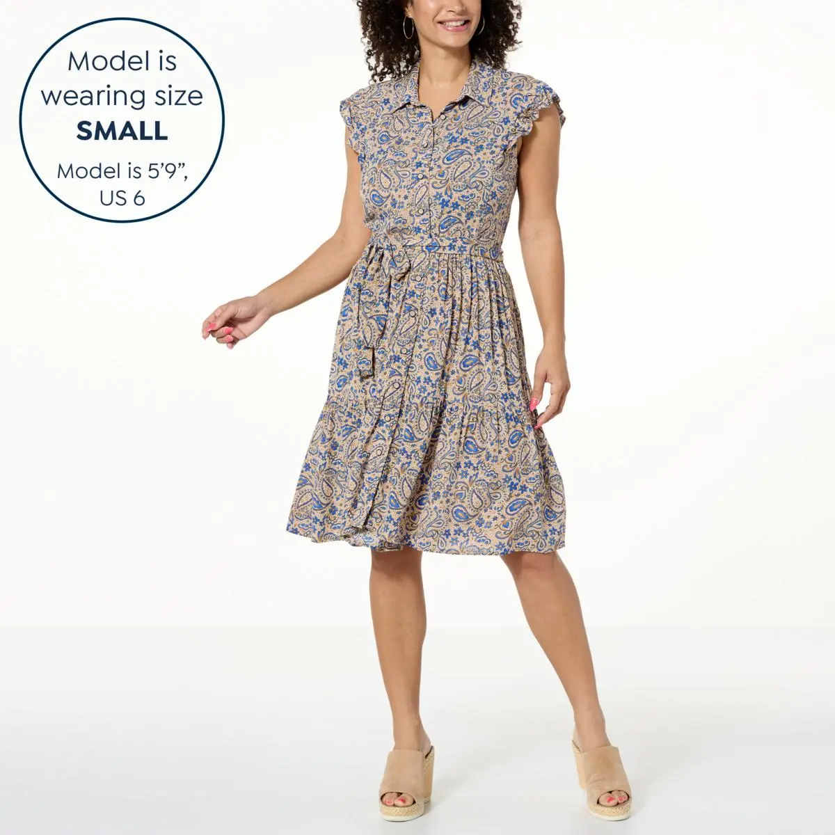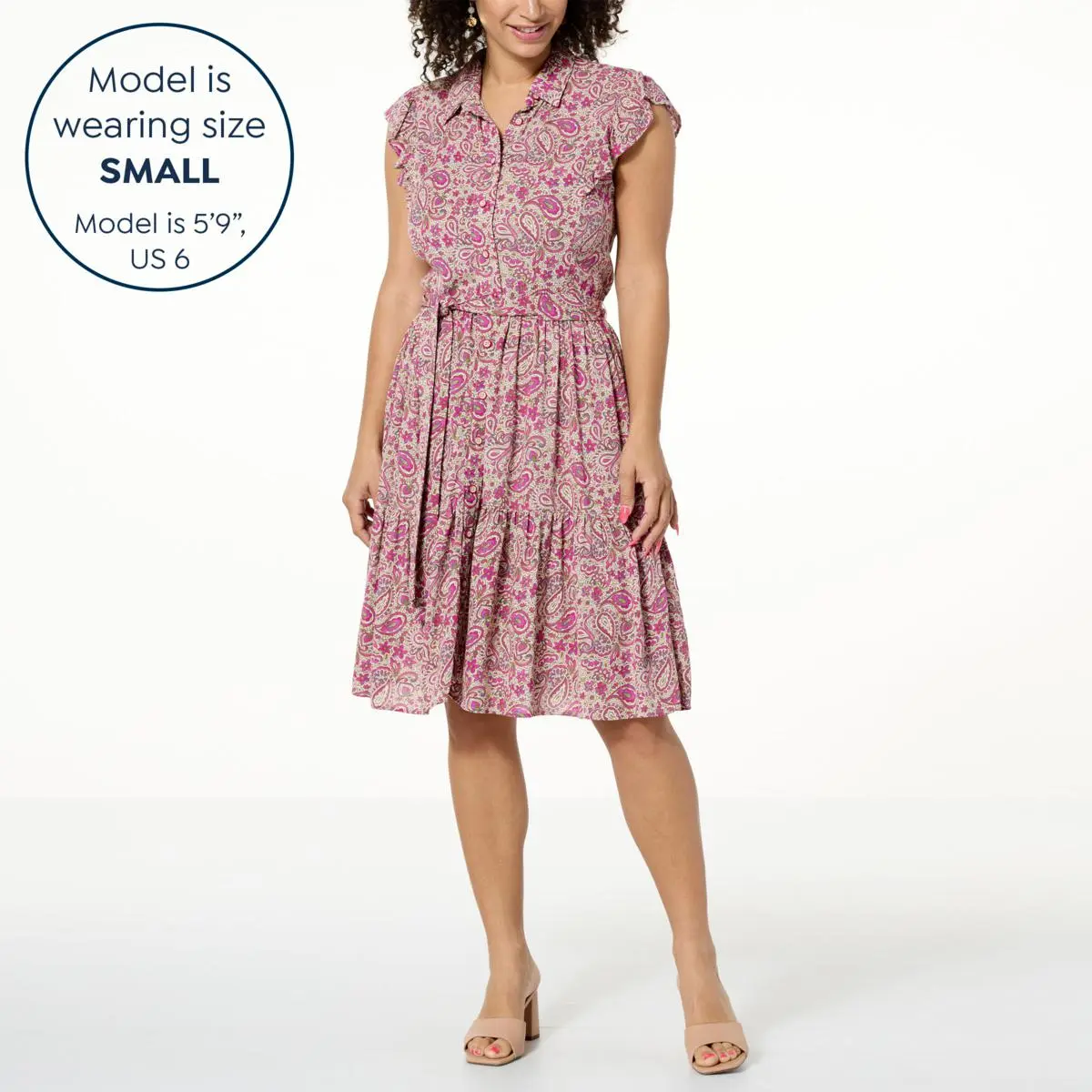 Democracy Flutter-Sleeve Button-Down Printed Dress Get easy, breezy style with this woven crinkled fashion dress complete with side pockets, a button-down front, and chic paisley print.
