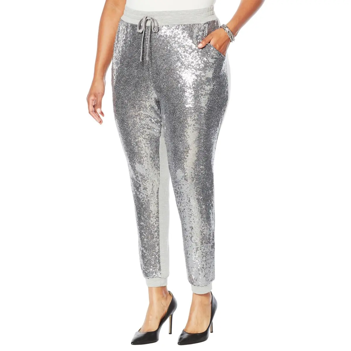 DG2 by Diane Gilman Sequined Front Pull-On Slim Jogger Pant  Add a little sparkle to your lounge collection with these French terry knit pants from Diane Gilman. The front of the slim, jogger-style legs have a mesh backing lined with glam sequins, while side pockets and cute, cuffed ankles add to the playful look.