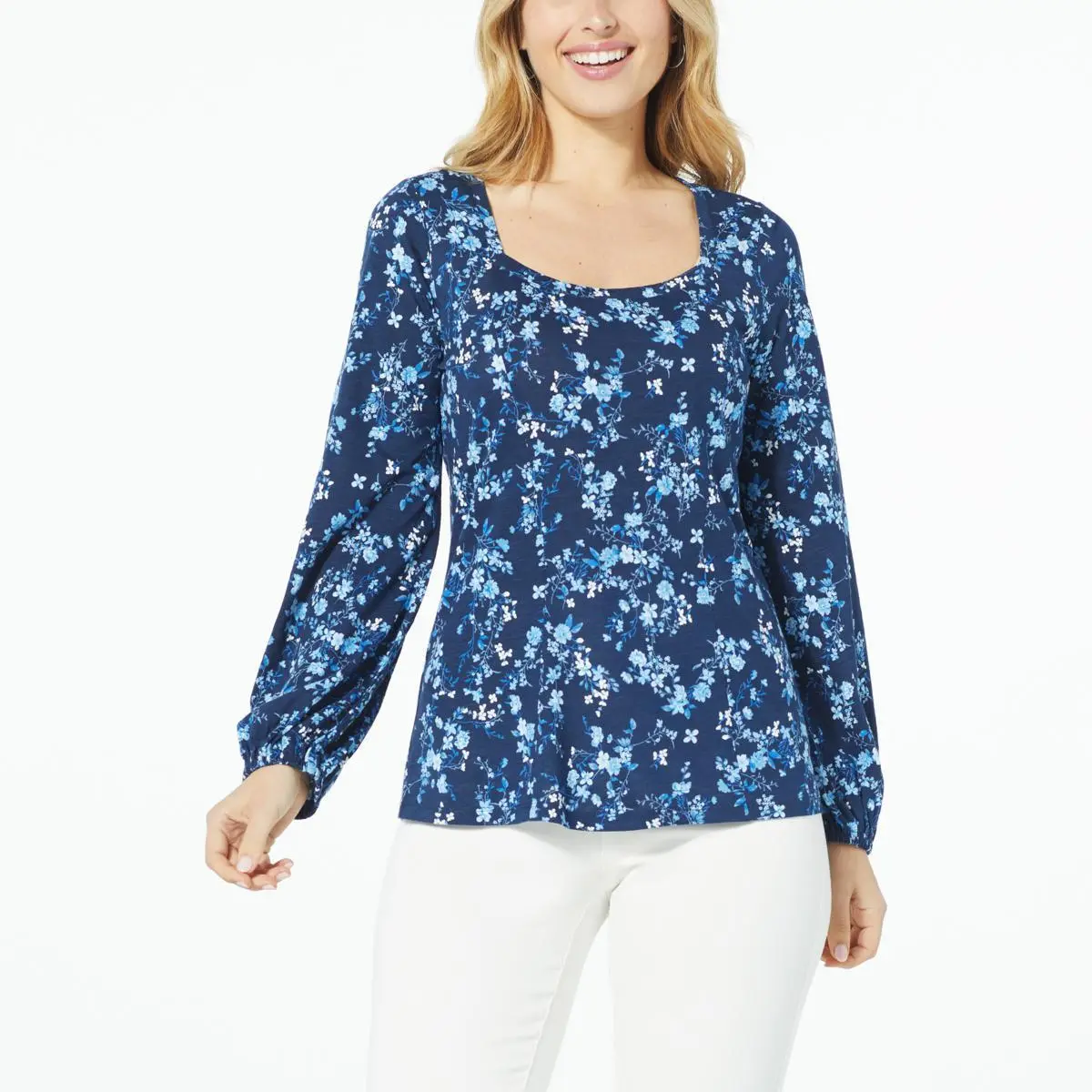 DG2 by Diane Gilman Square-Neck Puff-Sleeve Top Who wants to be a princess when peasants dress like this? The printed, peasant-style top from Diane Gilman features a soft cotton-blend slub knit fabric, long puff sleeves, and a face-framing square neckline that will have you looking like royalty (or their fashionably dressed subjects) from workday to weekend.