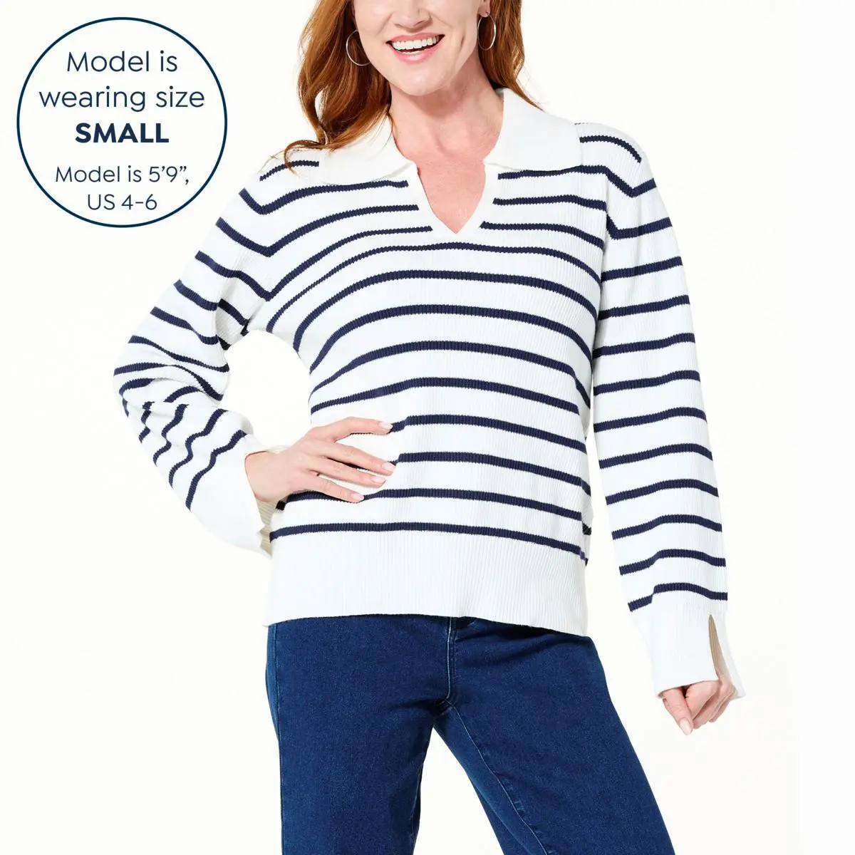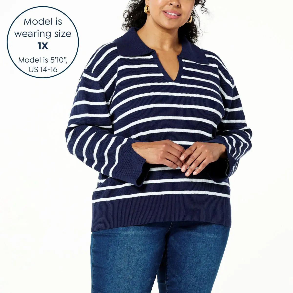 DG2 by Diane Gilman Striped Organic Cotton Collared Pullover Stripe it rich in this soft and stylish, organic cotton top from Diane Gilman. The season-spanning, long-sleeve nautical-inspired sweater design features a pointed Johnny collar, eco-friendly fabric and an effortless pullover silhouette.