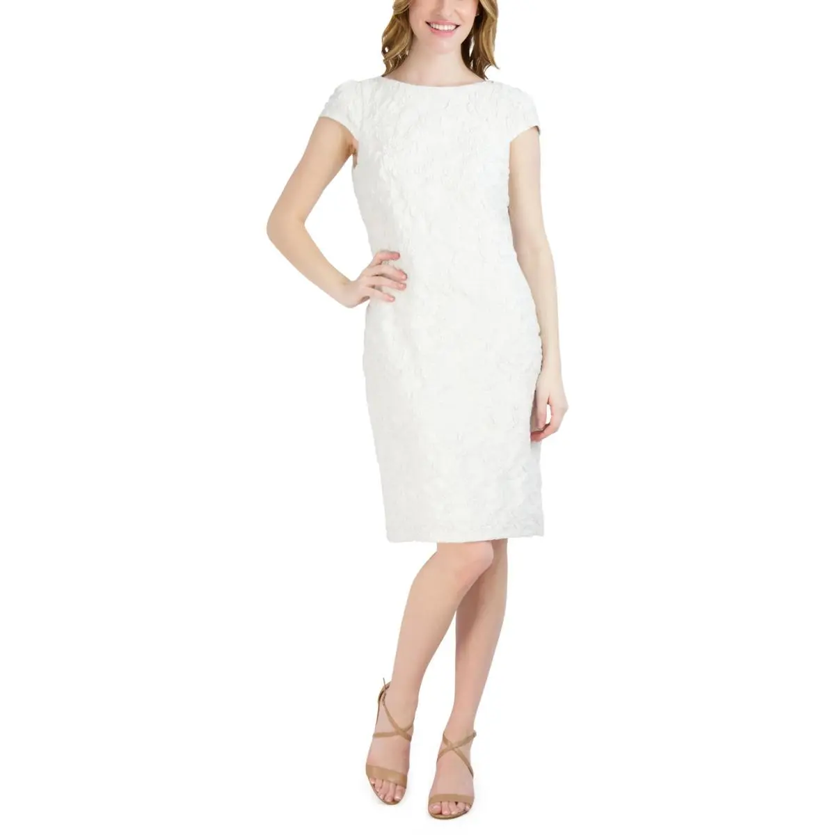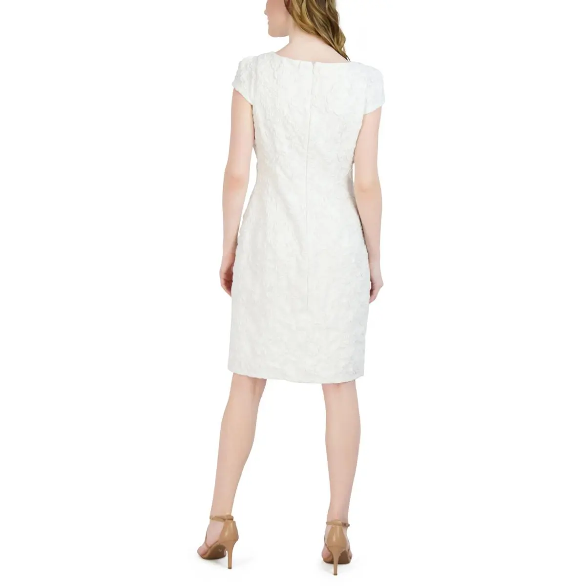 Donna Ricco Cap Sleeve Puff Jacquard Sheath Dress A wardrobe must-have that is combined with sophistication and style, this stunning ivory fitted dress is designed for special outings to important presentations. Round neck Cap sleeve Concealed back zip closure Below-knee length Sheath 90% Polyester, 10% metallic Imported