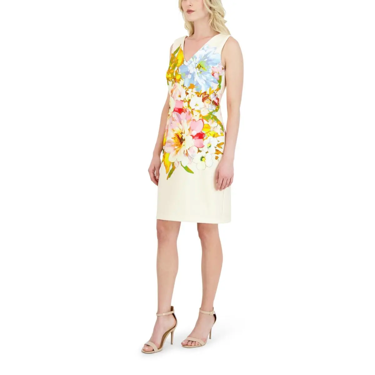 Donna Ricco Sleeveless V-Neck Printed SCUBA Sheath Dress With it’s captivating display of floral patterns spread throughout, this eye-catching printed scuba sheath dress in ivory, is a fit and fabulous style that’s perfectly made for dinner dates and nights to the theater. V-neck Sleeveless Concealed back zip Just-below-knee length Sheath silhouette 95% Polyester, 5% spandex Imported