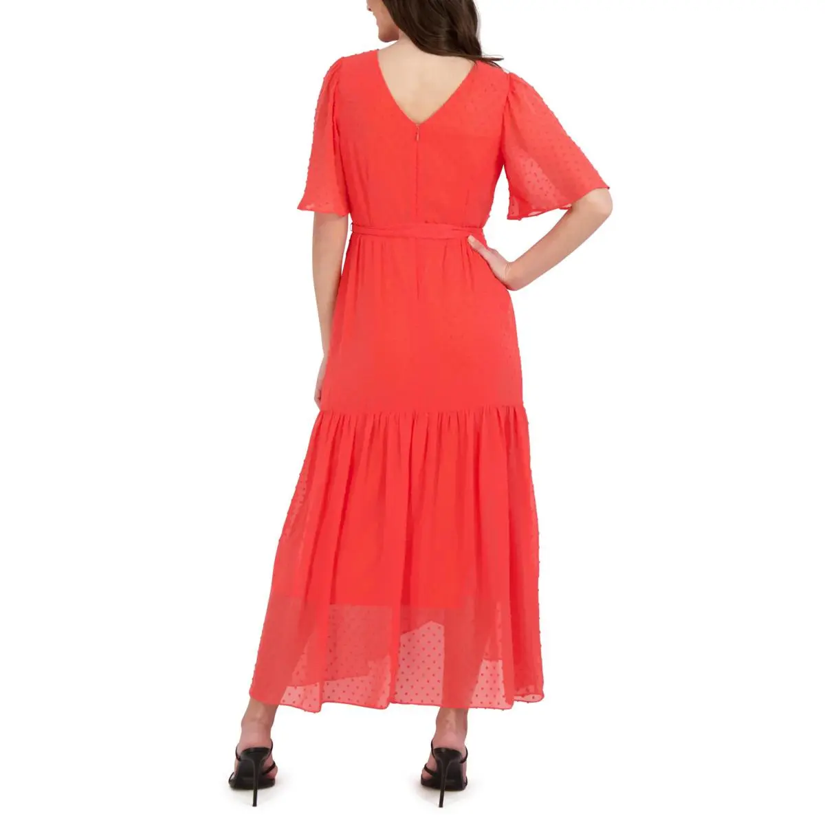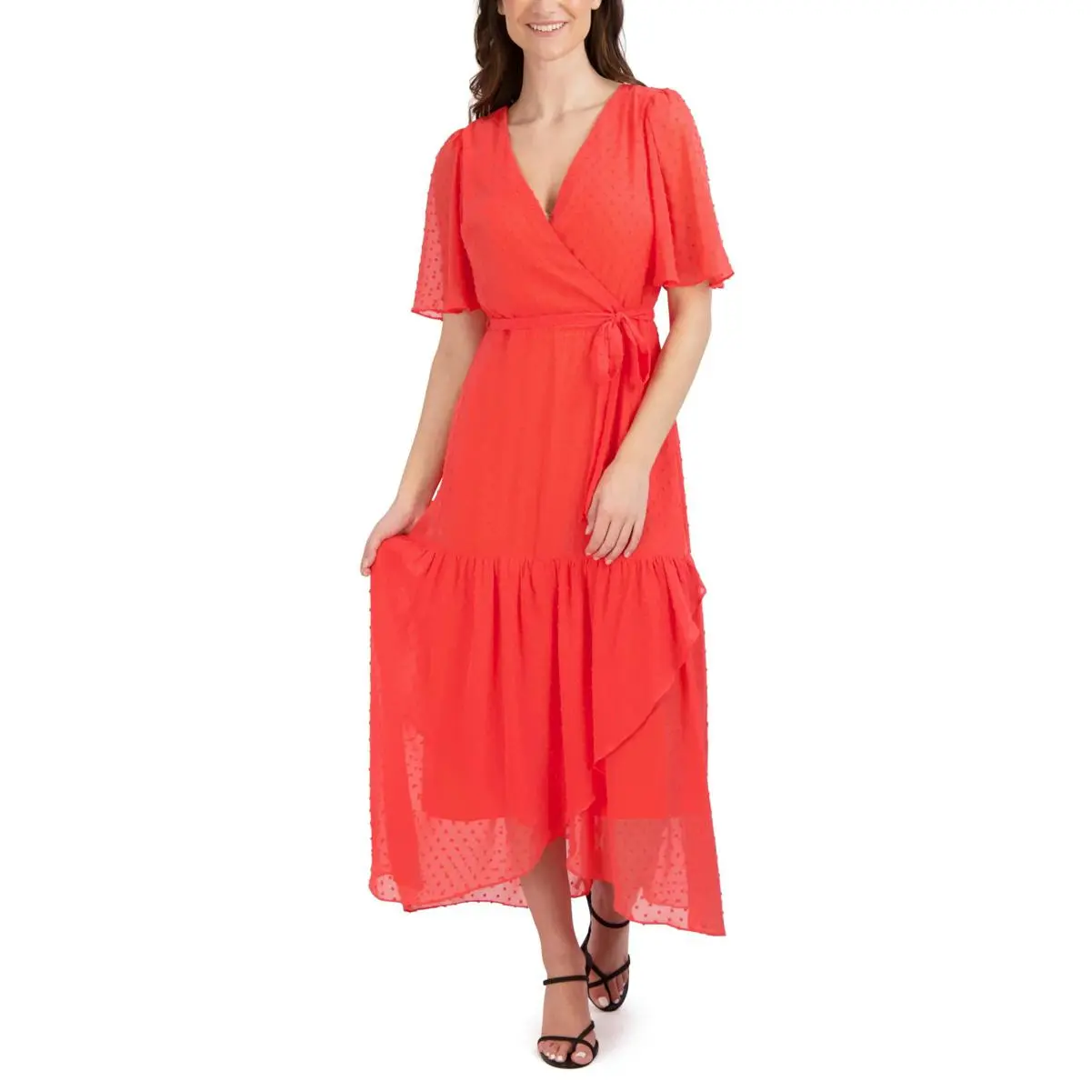 Donna Ricco V-Neck Short Sleeve Wrap Tie Waist Midi Dress A flowy vibrant piece perfect for Caribbean cruise vacations to enjoying drinks by the pool, this stunning clip dot chiffon maxi dress is a relaxed and chic look that’s designed with a deep v-neckline, tie waist, and high-low hemline.