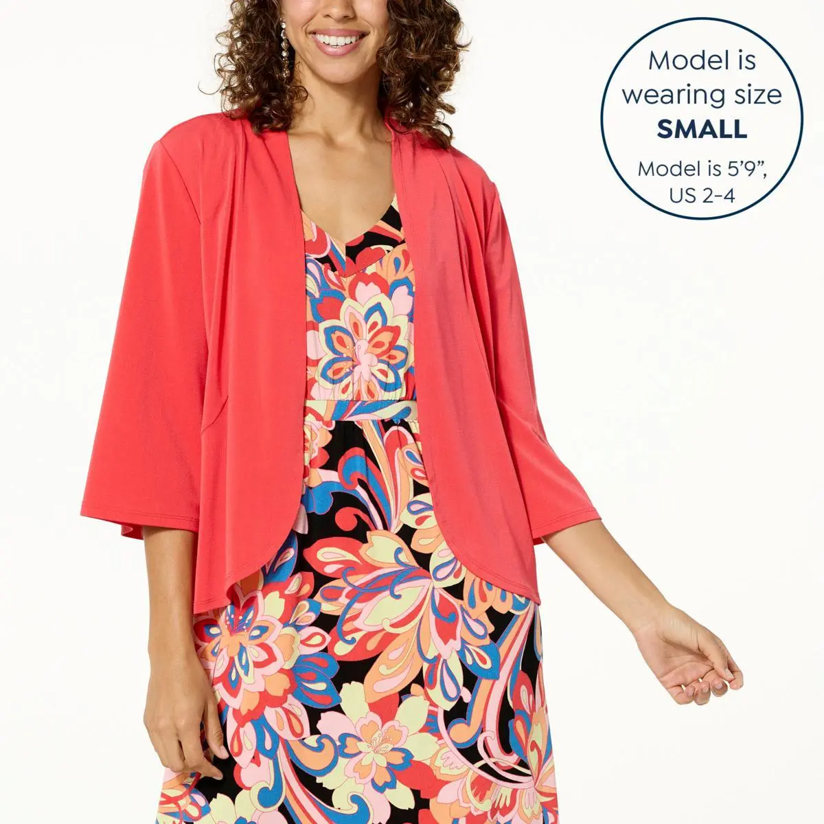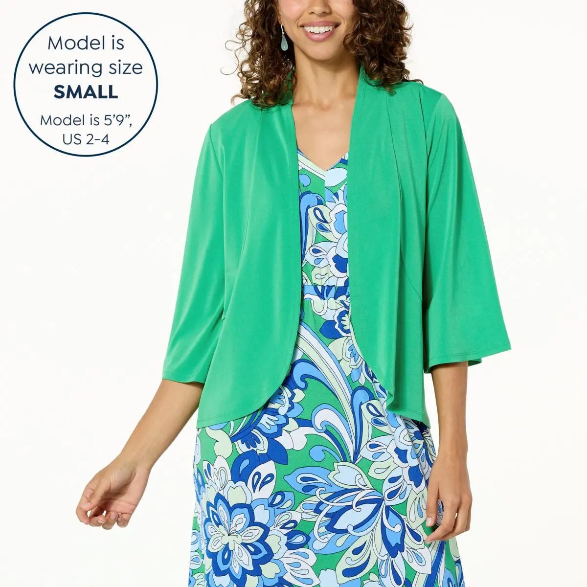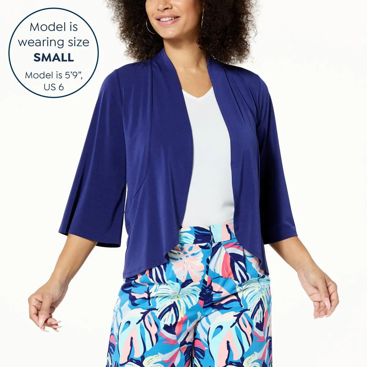 IMAN Global Chic 3/4-Sleeve Open Front Knit Cardigan Add a layer of luxury with our classic, open-front cardigan from Iman. Â
