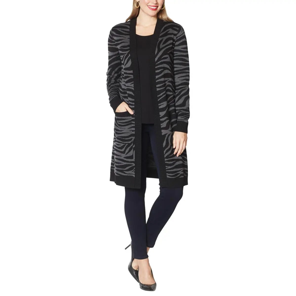 IMAN Global Chic Animal Print Open-Front Cardigan Add a layer of luxury to your ensemble with this sophisticated, open-front cardigan from Iman.