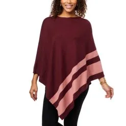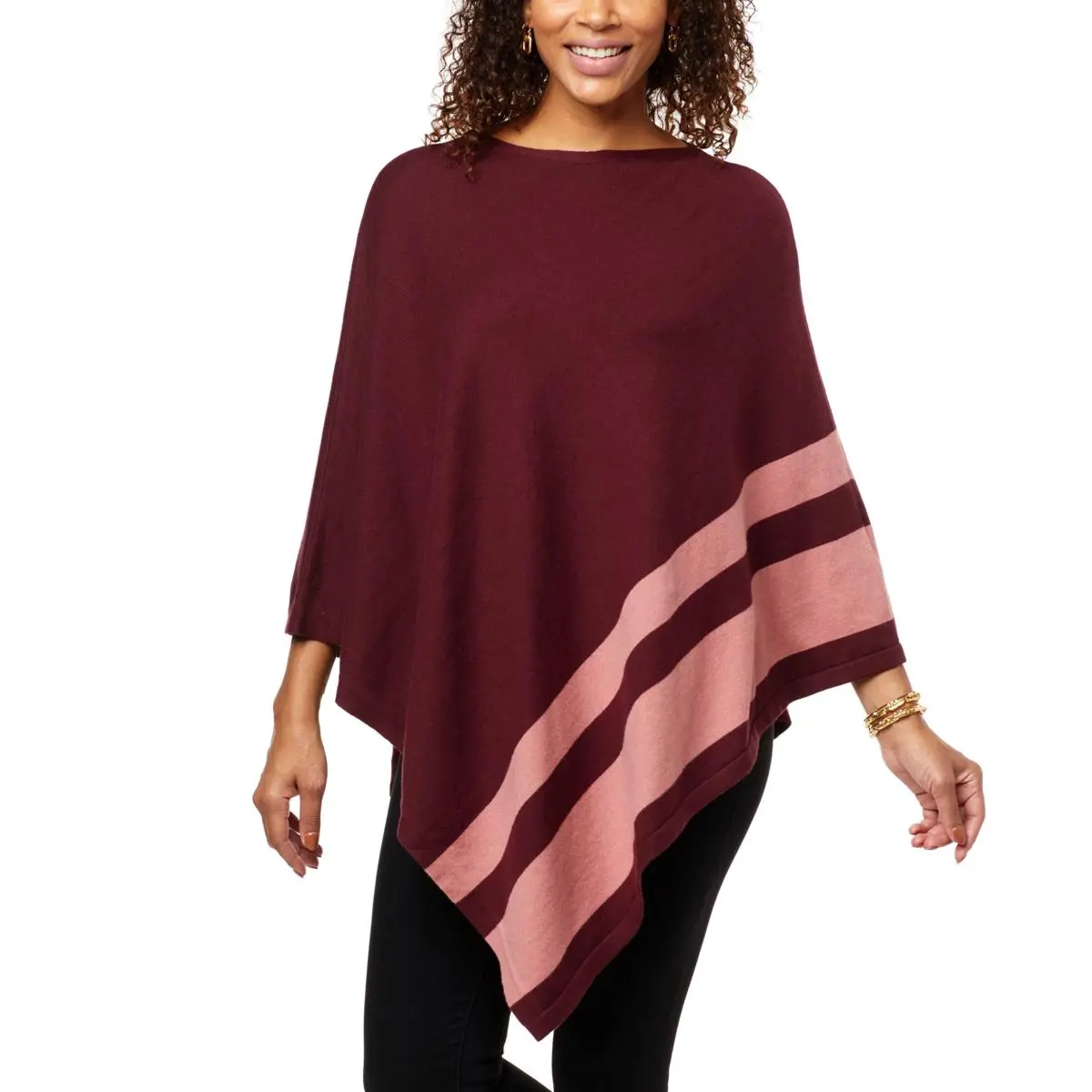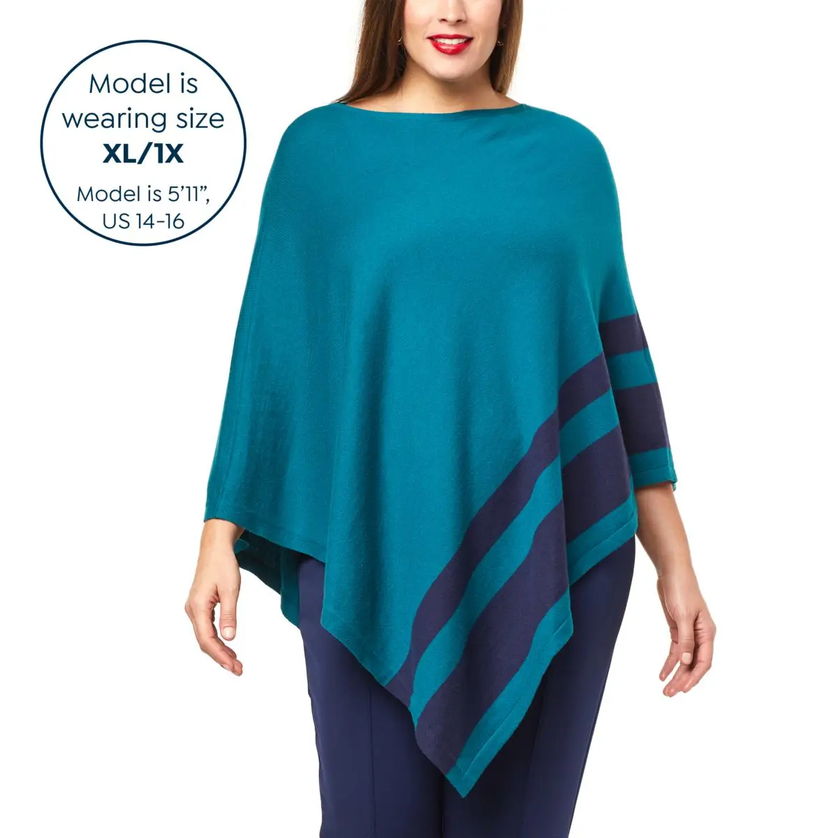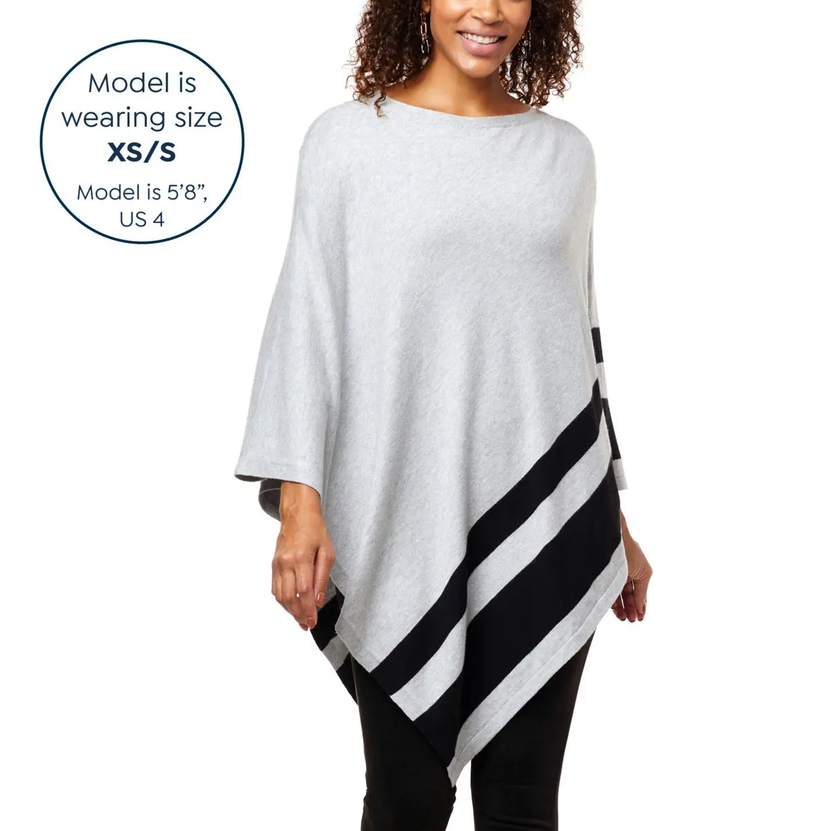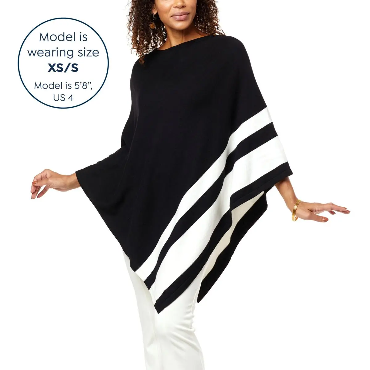 IMAN Global Chic Asymmetric Poncho with Stripe Detail Keep the chill at bay in a stylish way. This striped poncho offers a cozy-chic look that complements any ensemble, creating added warmth and fashionable flair.
