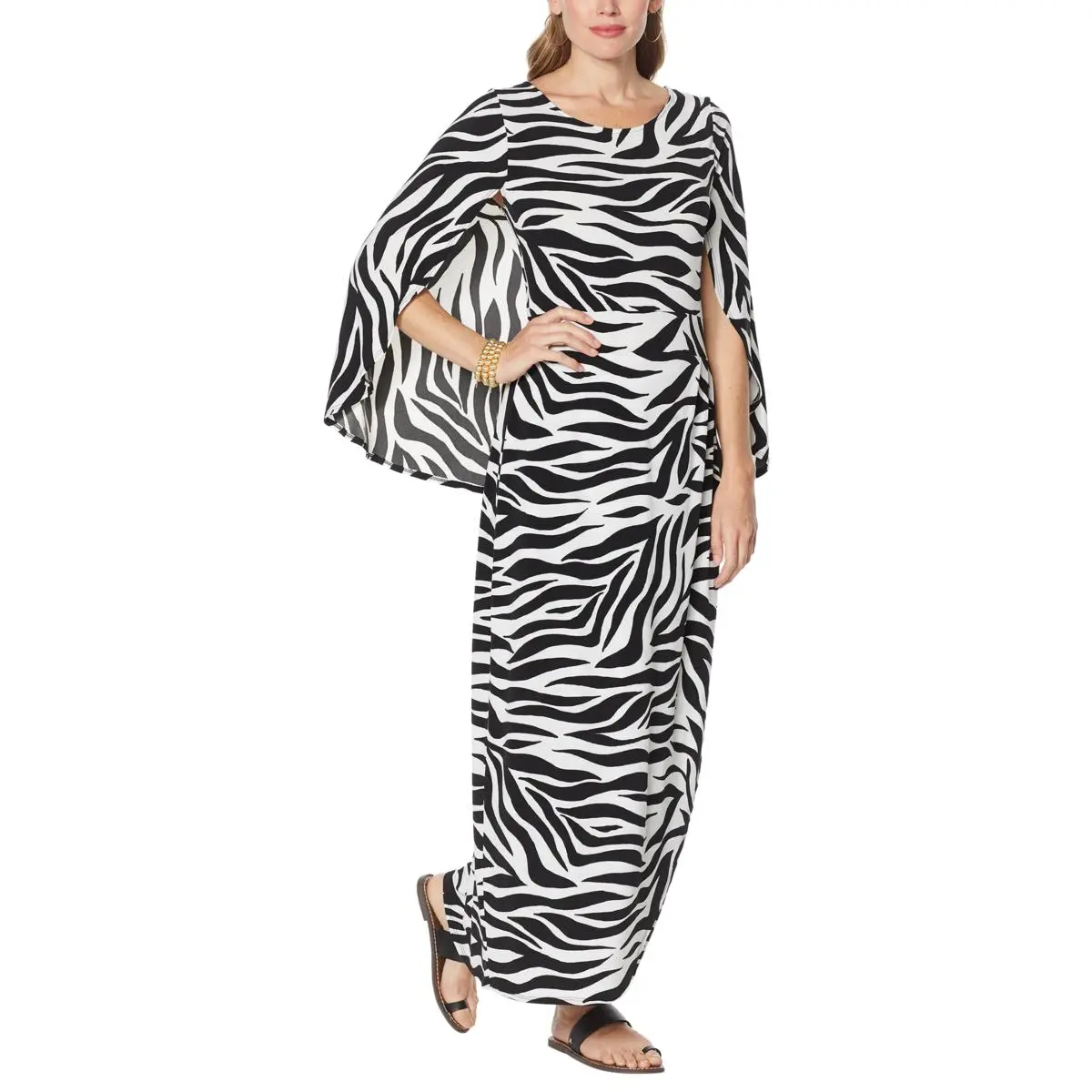 IMAN Global Chic Caped Zebra-Print Maxi Dress This figure-flattering dress is just what you need to complete your wardrobe. With its stunning capelet overlay, you’ll be able to stop traffic with a single glance.