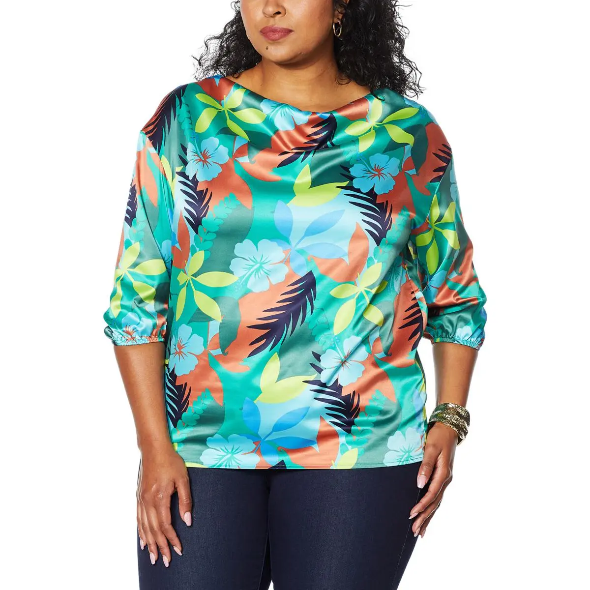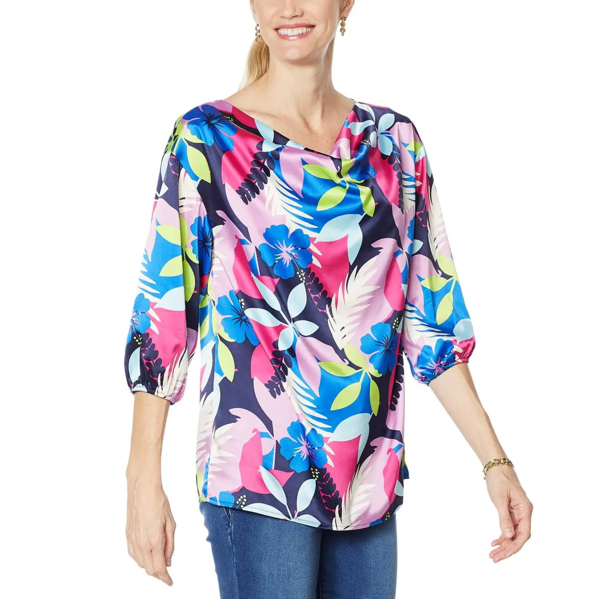 IMAN Global Chic Cowl-Neck Woven 3/4 Sleeve Top The perfect complement to any of your favorite bottoms, this cowl-neck top has a vibrant print that livens any ensemble.