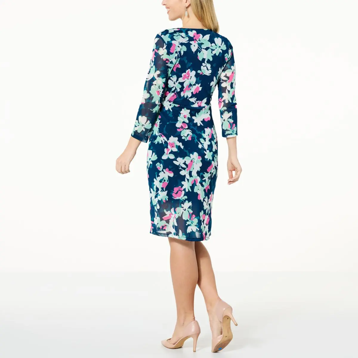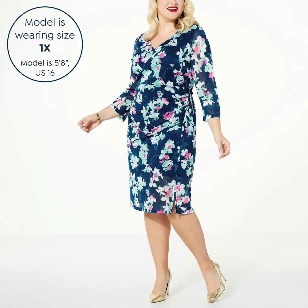 IMAN Global Chic Printed Mesh Surplice Dress with Front Slit Get the perfect polished look when wearing this figure-flattering printed mesh dress that’s ideal for any occasion.