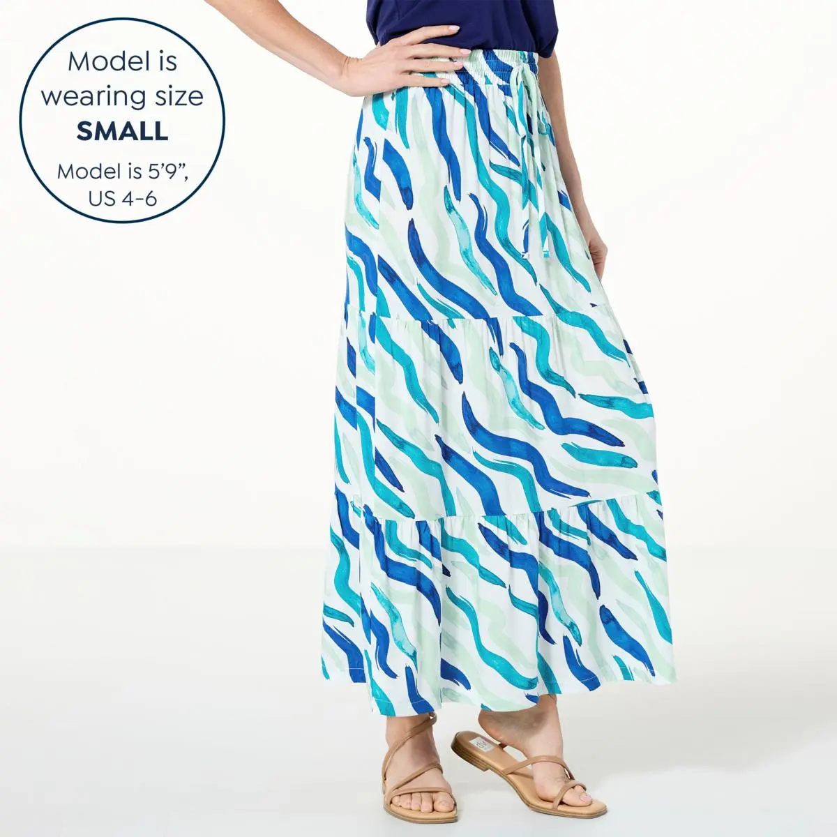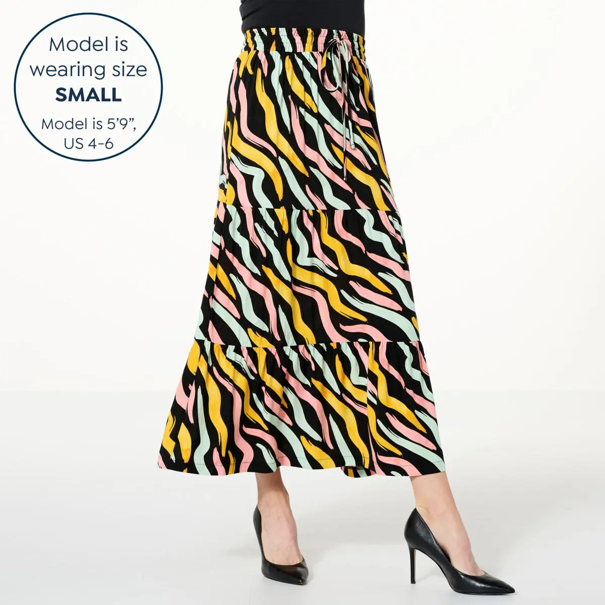 IMAN Global Chic Tiered Maxi Skirt with Drawstring Waist Comfortably chic and elegant, this maxi skirt makes the perfect staple piece. It’s the ideal garment for year-round style.