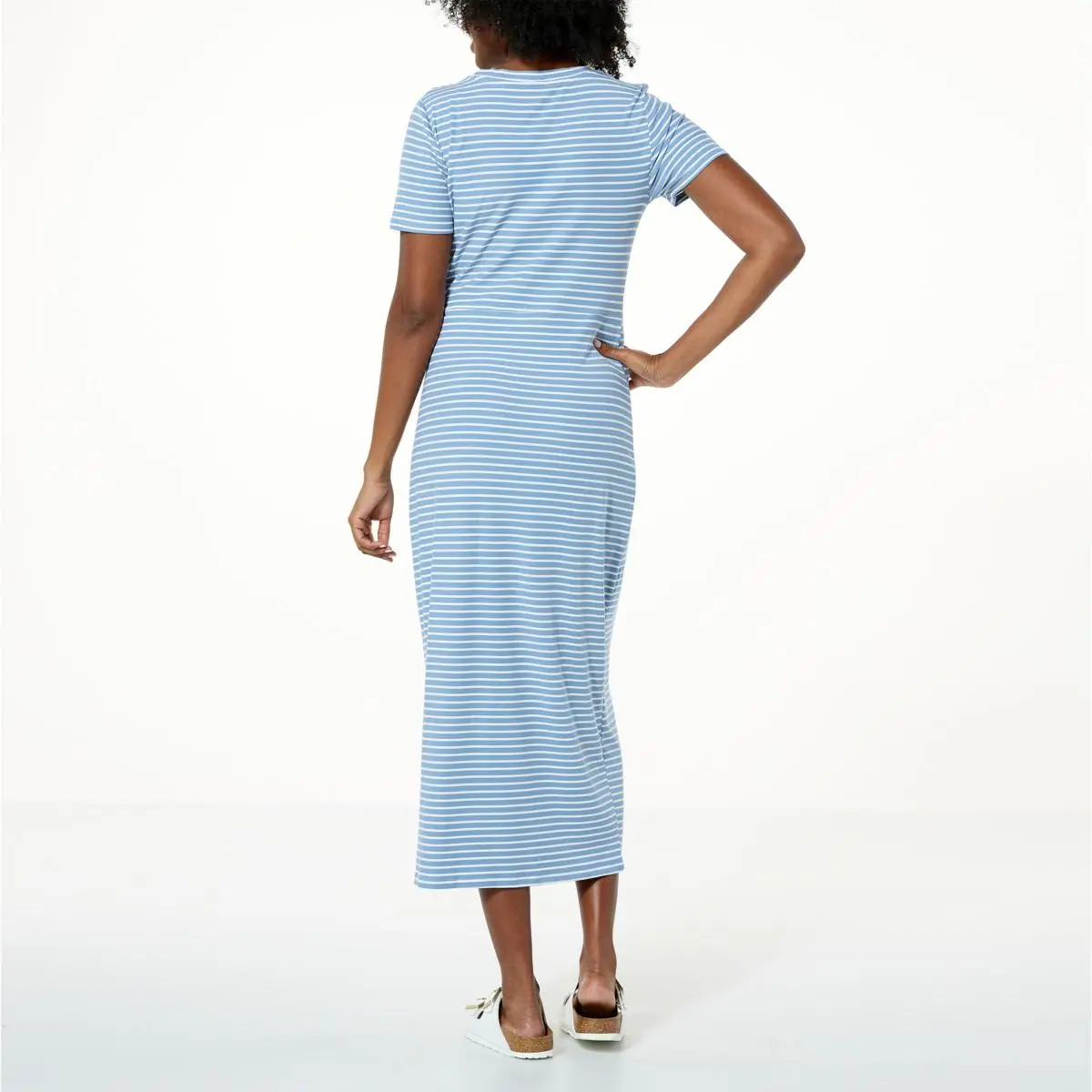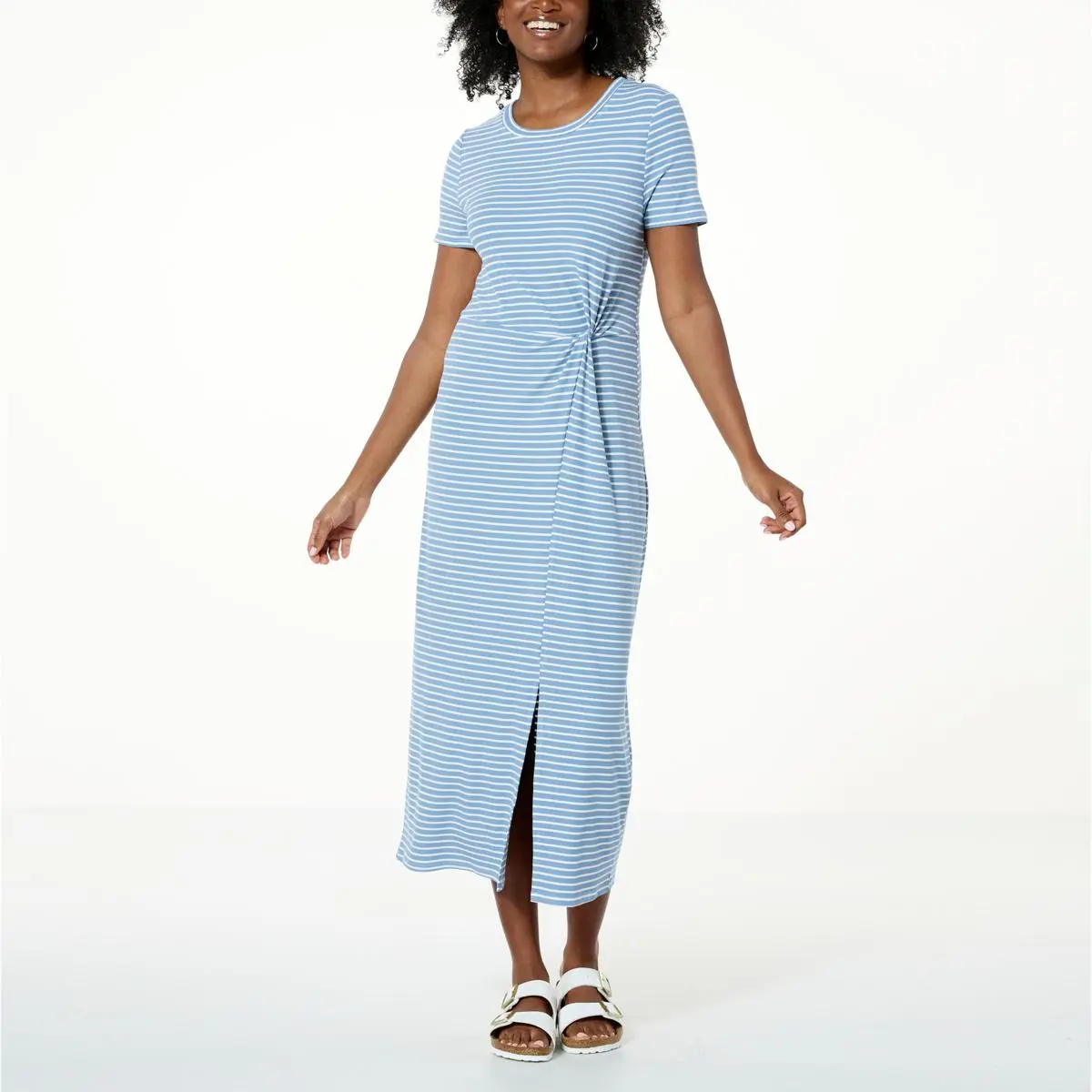 Jaclyn Smith Striped Knit Knot Front T-Shirt Dress  Effortless dressing is at its cutest with this must-have crew-neck dress, featuring a trendy twisted knot that pulls in the silhouette to lightly hug the figure… because even on your most casual days, you deserve to look your best!