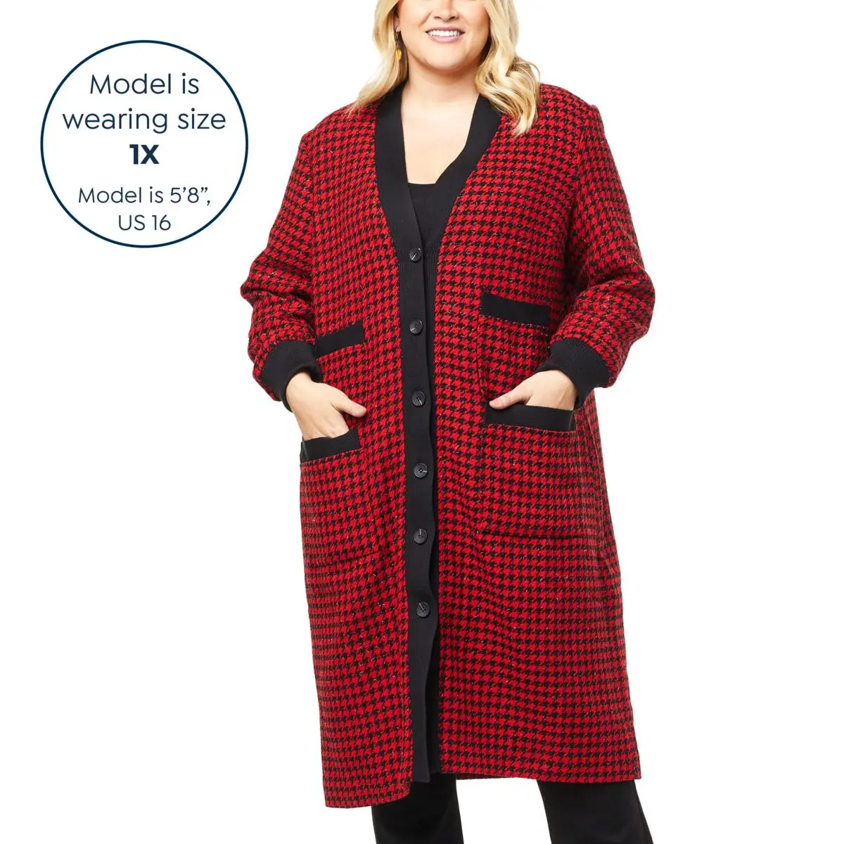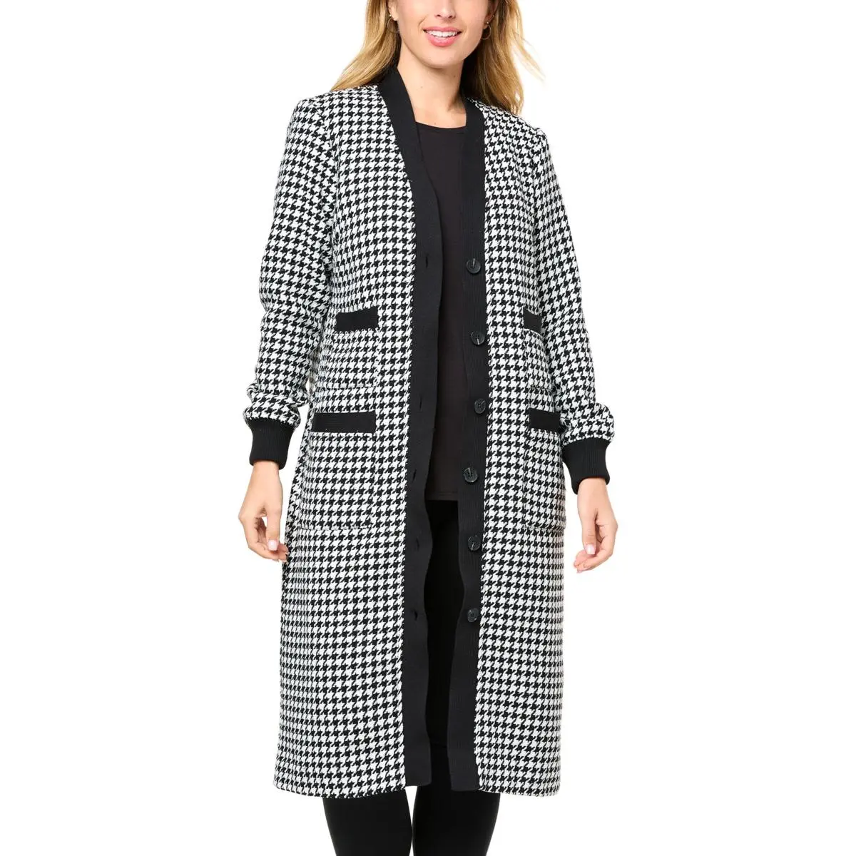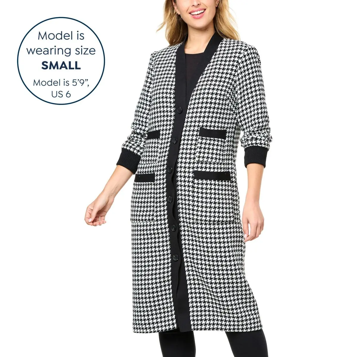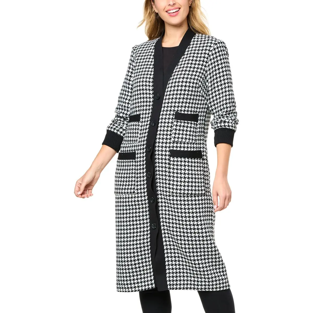 kathy ireland® Fashion 360 The Gigi Long Tweed Cardigan Both modern and classic, the versatile houndstooth print is having a must-have fashion moment. This cardigan-style coat punctuated with the iconic, jagged checkerboard pattern adds dimension and sophisticated style for a cold-weather-ready feel.