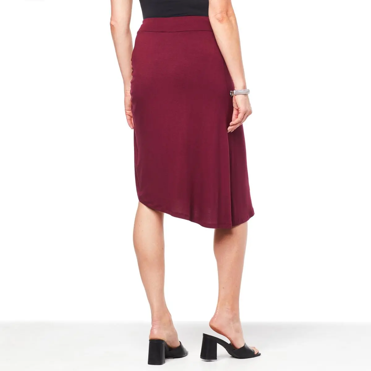 Laila Ali Asymmetric Ruched Skirt The asymmetric hem and ruched detail gives this midi-length skirt from Laila Ali a figure-flattering look you’ll love to wear again and again.