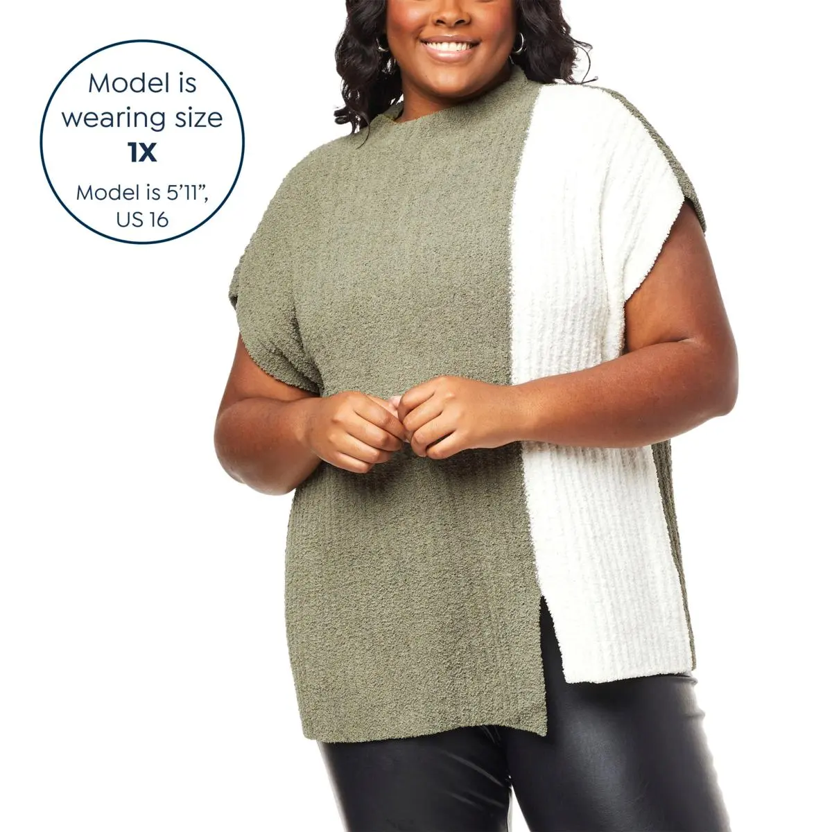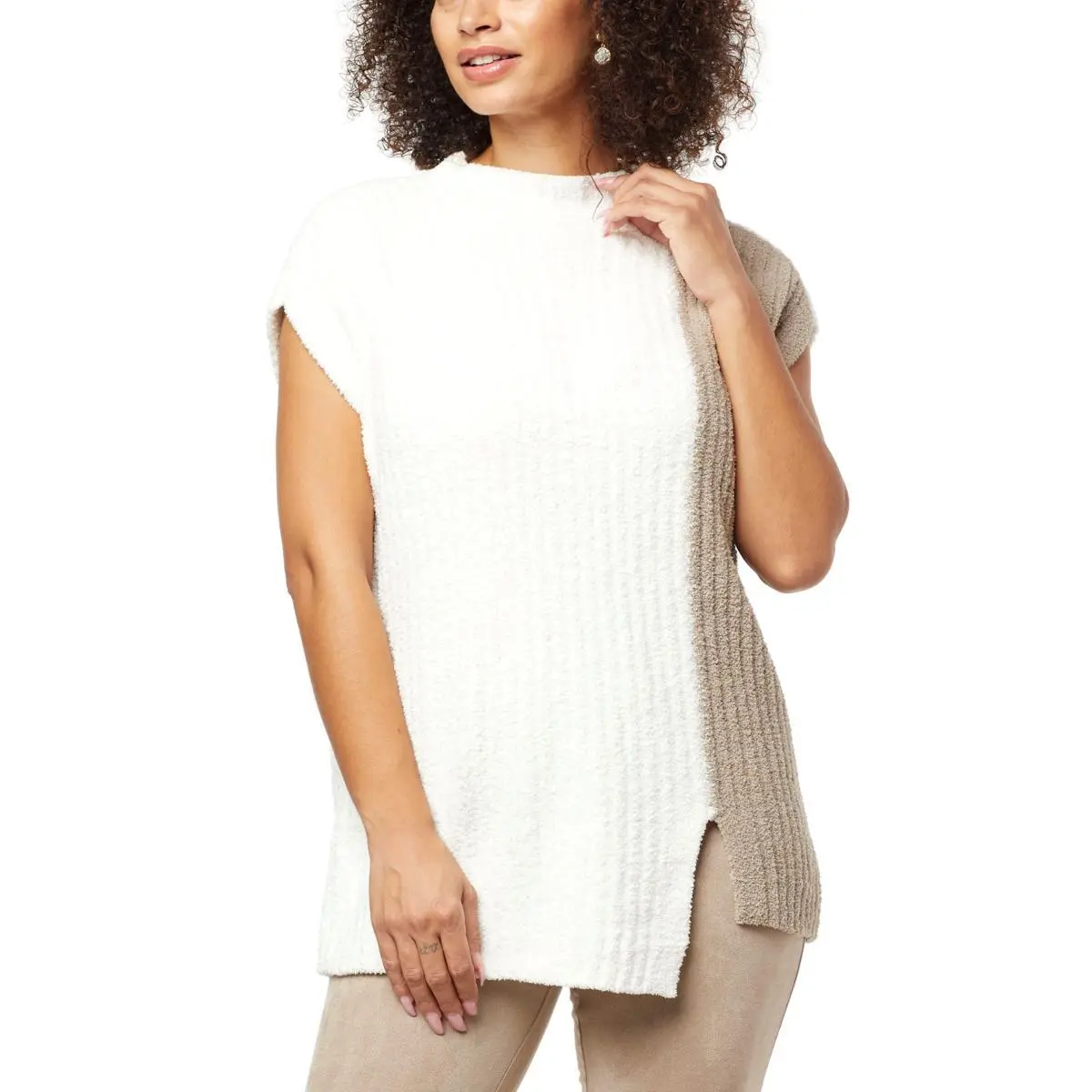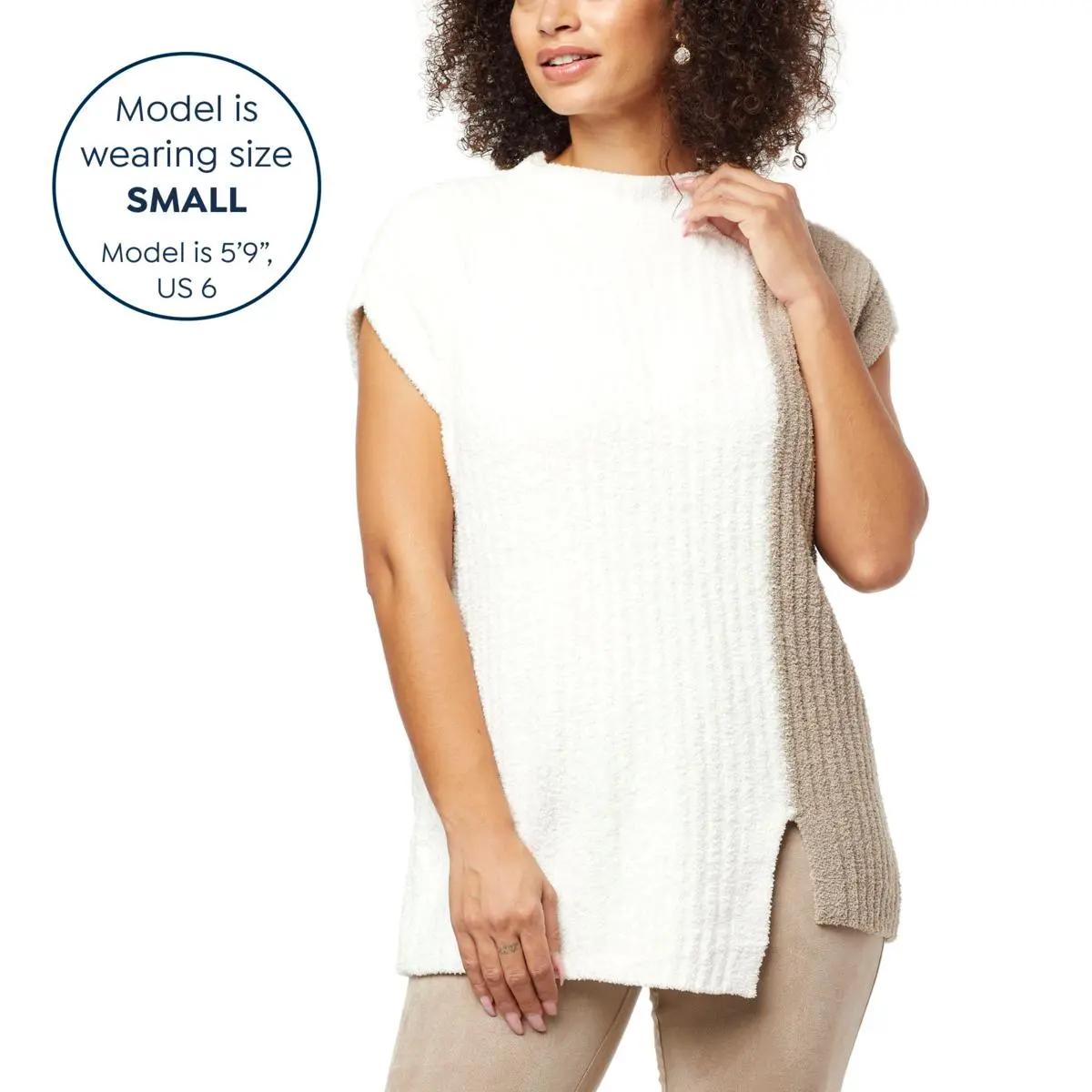 | Fabrication | Plush sweater knit with ribbed texture and 2-tone colorblocked pattern |
