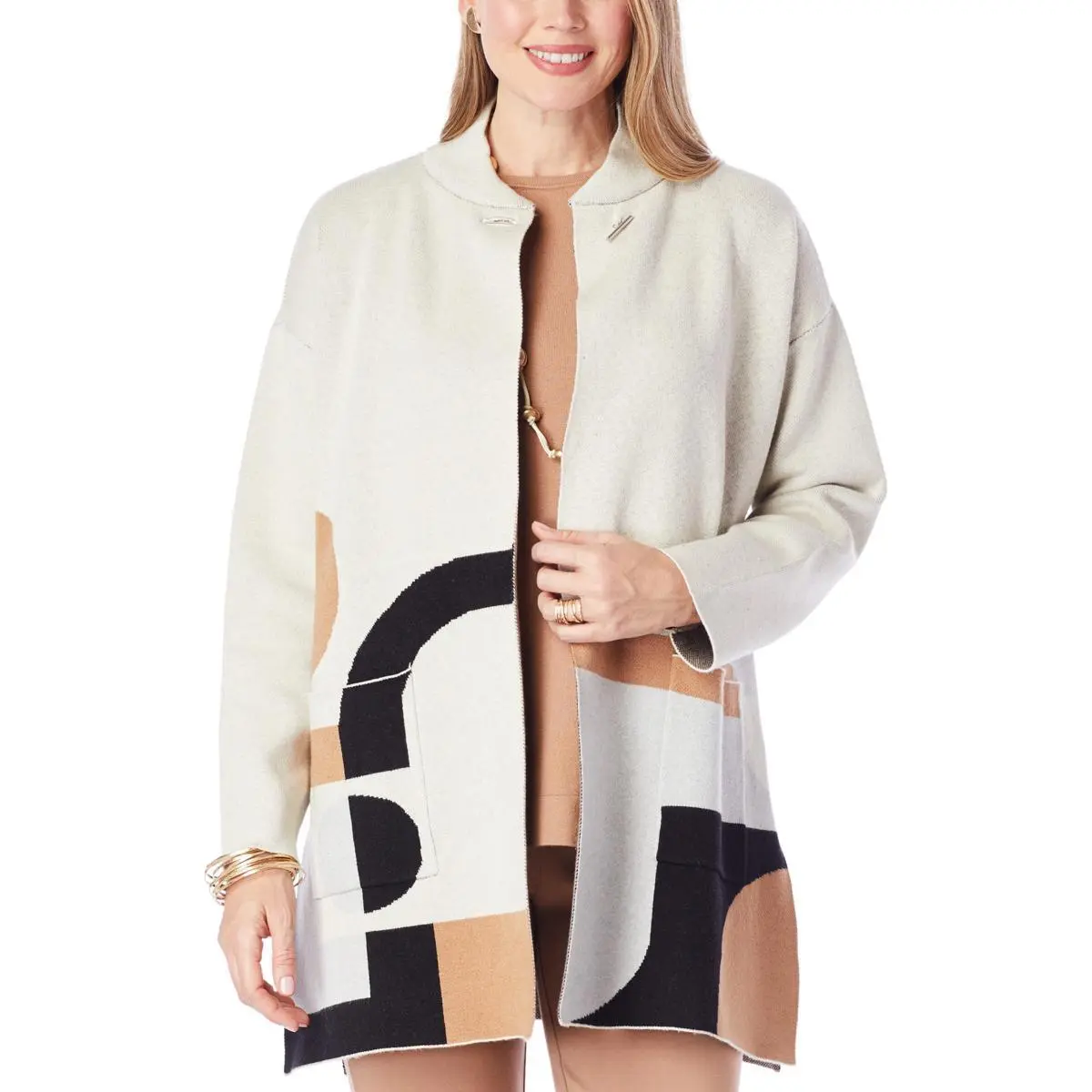 MarlaWynne Abstract Pattern Double Knit Cardigan This cozy cardigan features an abstract jacquard pattern that adds a unique style to your winter wardrobe. You’ll never want to take it off!