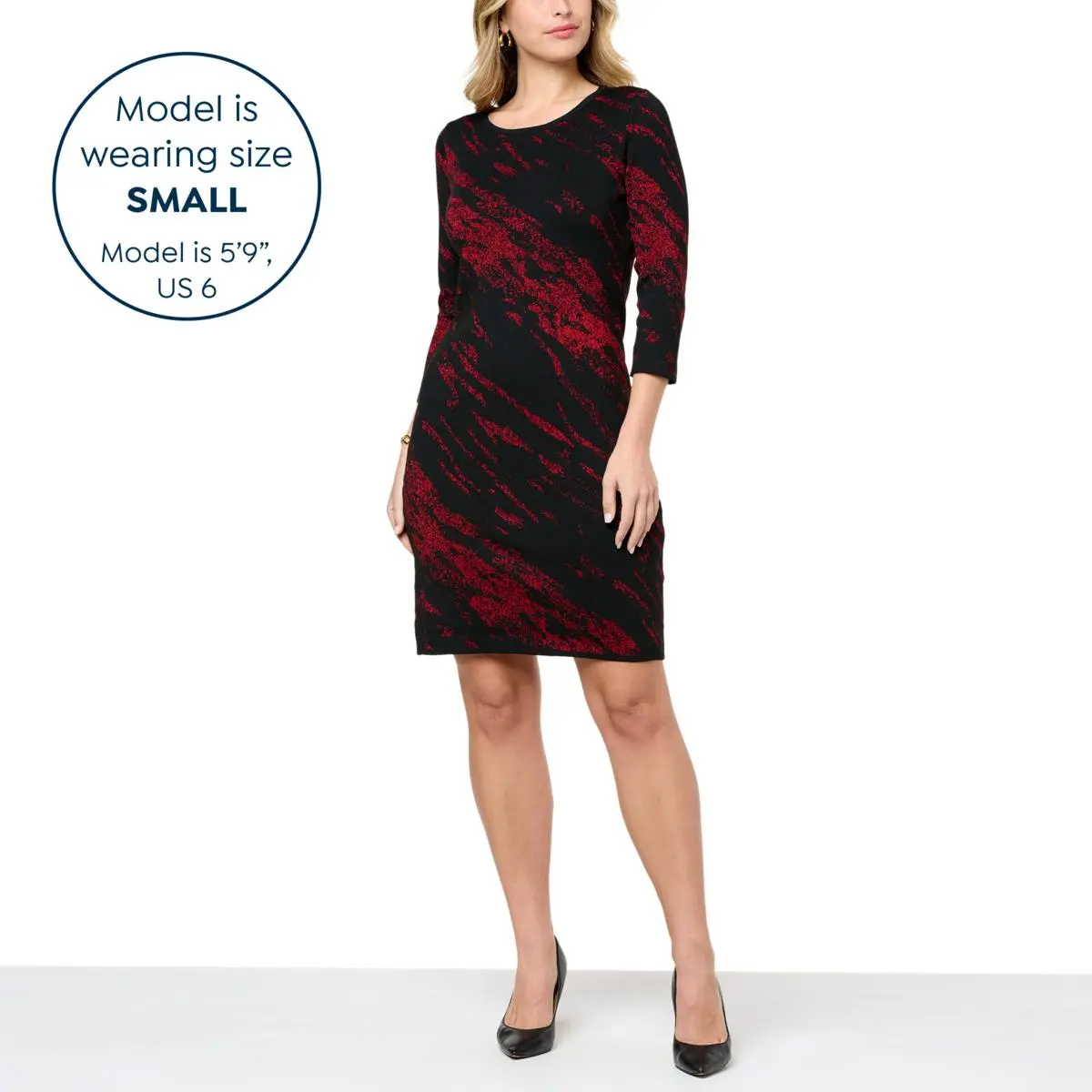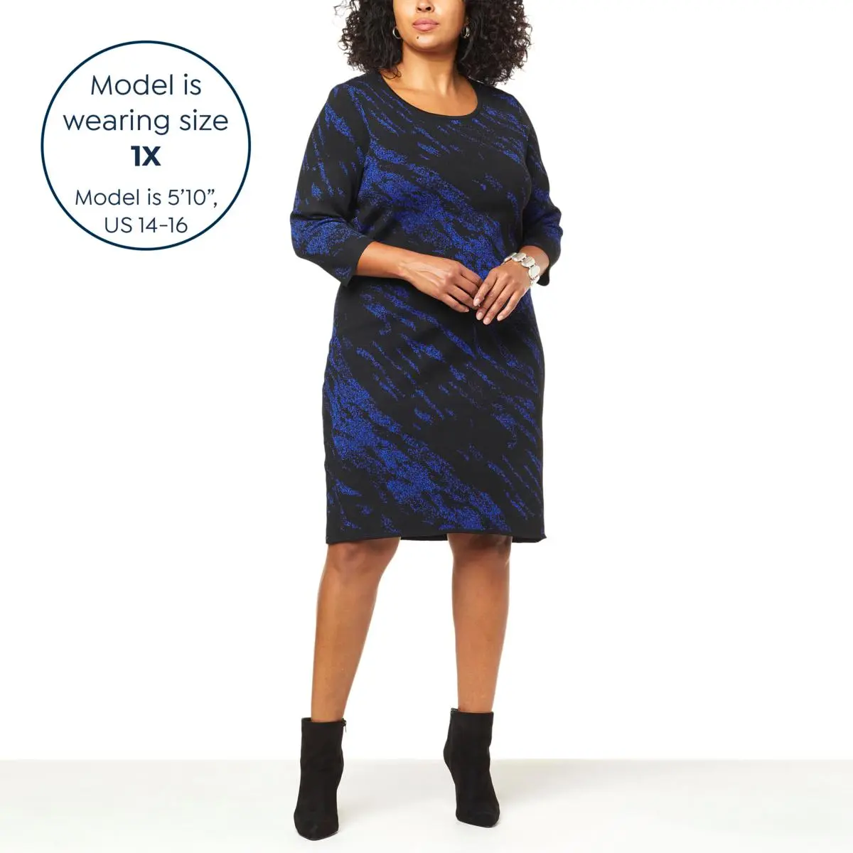 Nina Leonard 3/4-Sleeve Jewel Neck Sweater Dress This flattering sweater dress from Nina Leonard makes the perfect addition to your wardrobe collection. The gorgeous neckline is ideal to showcase your fabulous jewelry.