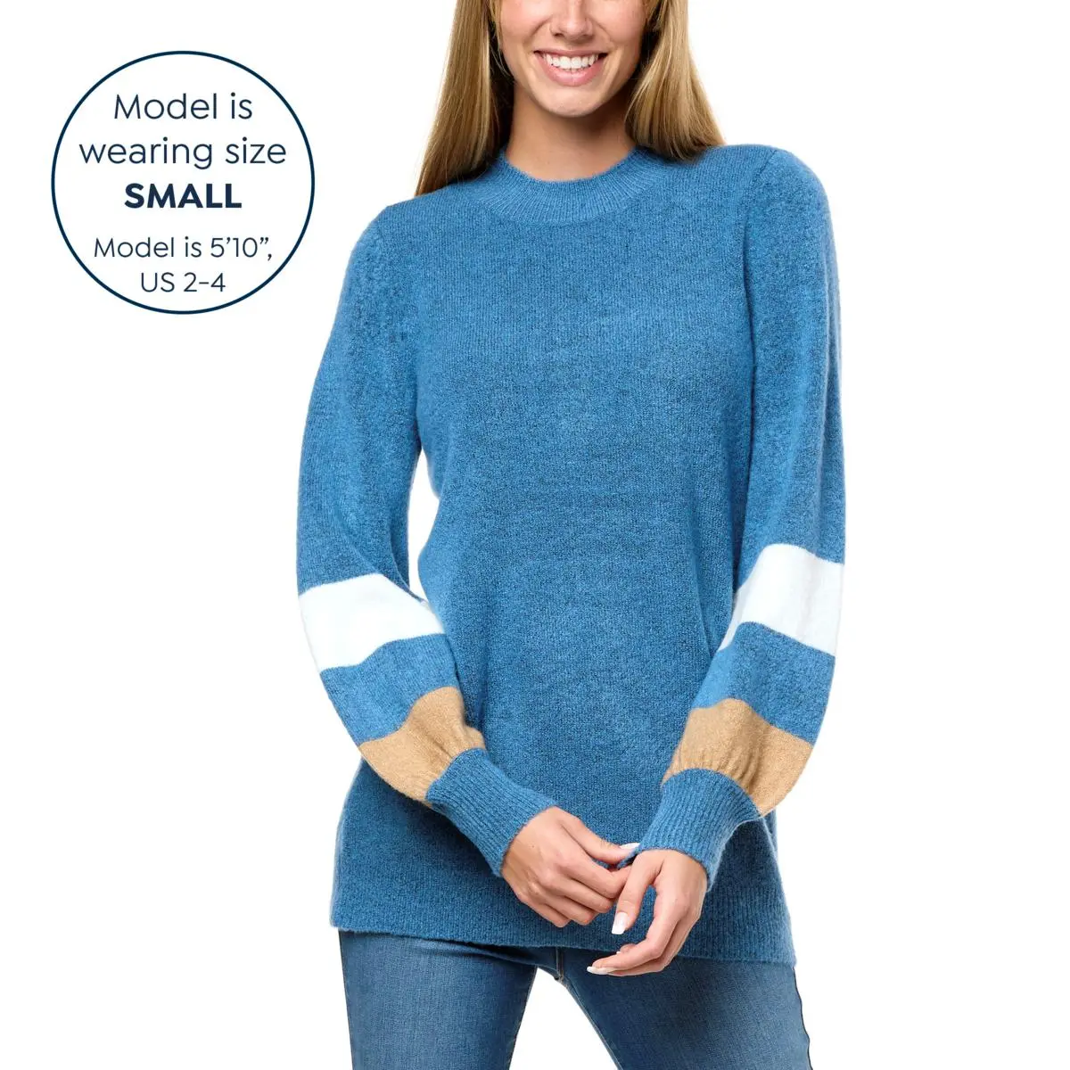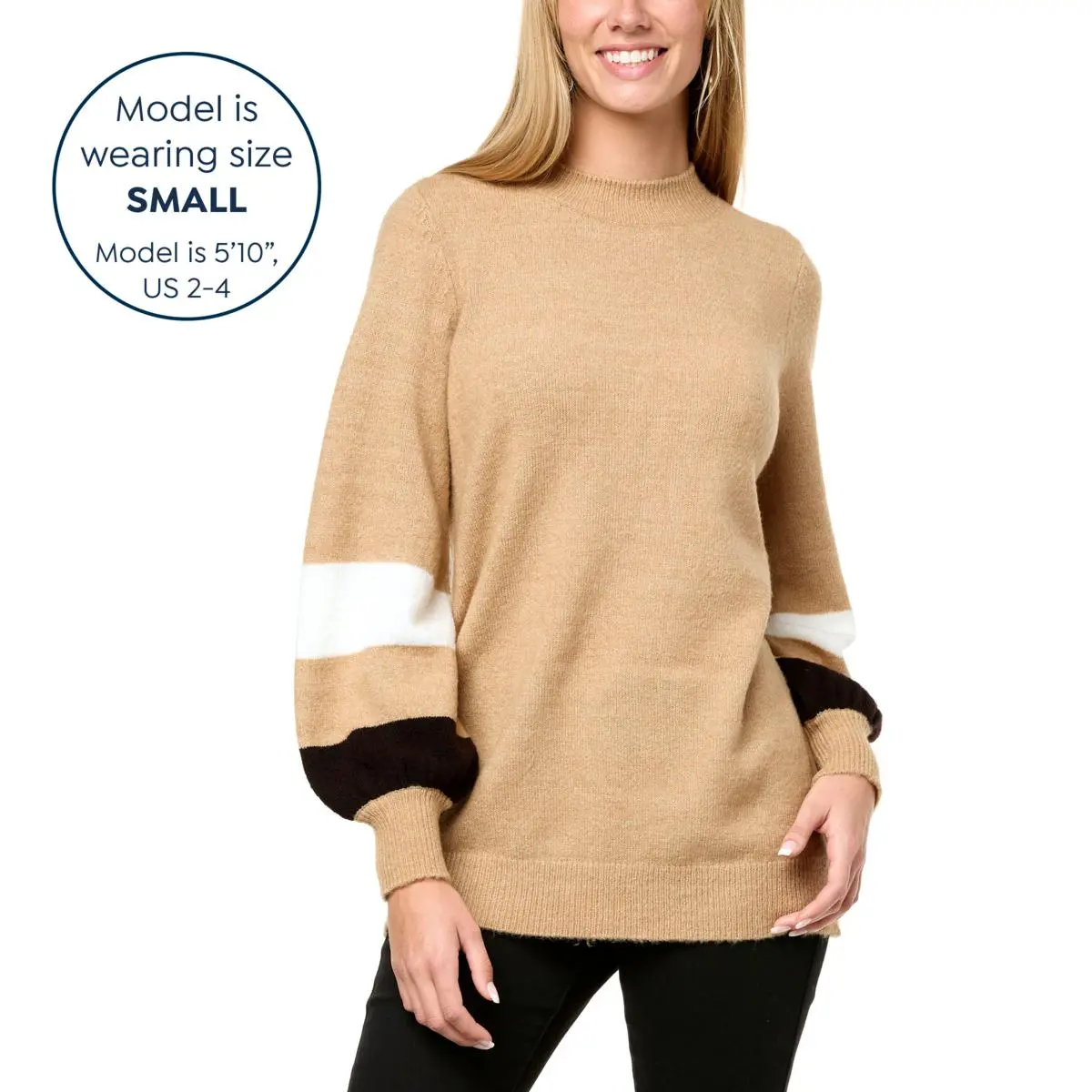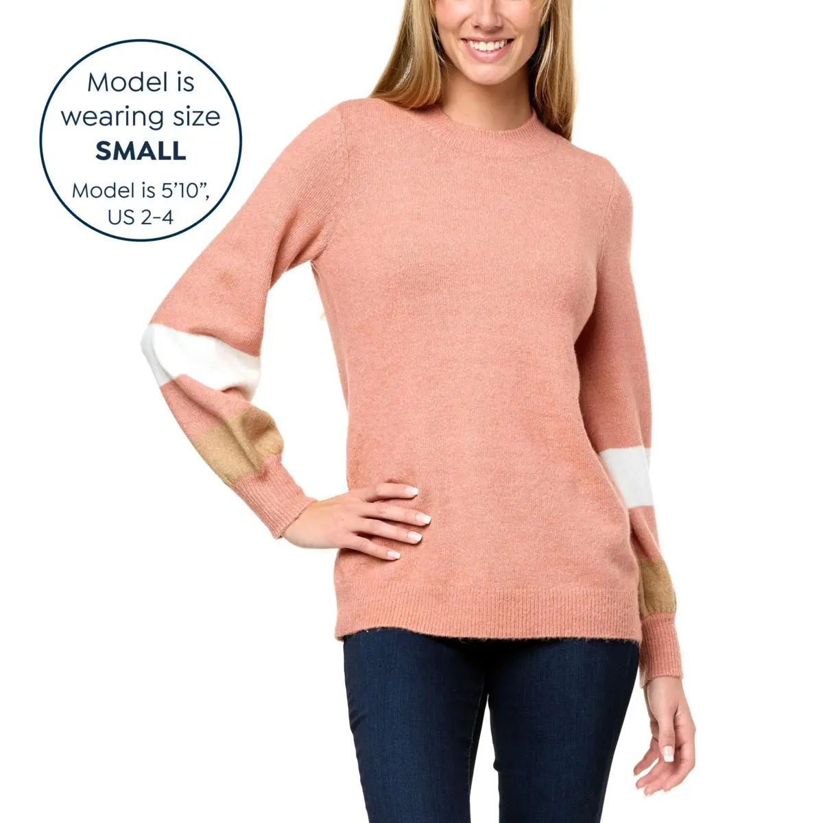 Nina Leonard Balloon Sleeve Pullover Sweater with Stripe Detail This cozy-chic pullover sweater, designed with dramatic striped balloon sleeves, is sure to make a fabulous fashion statement.