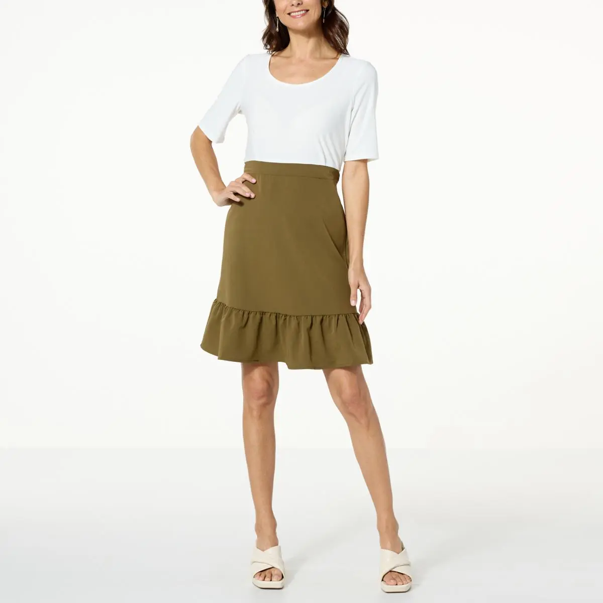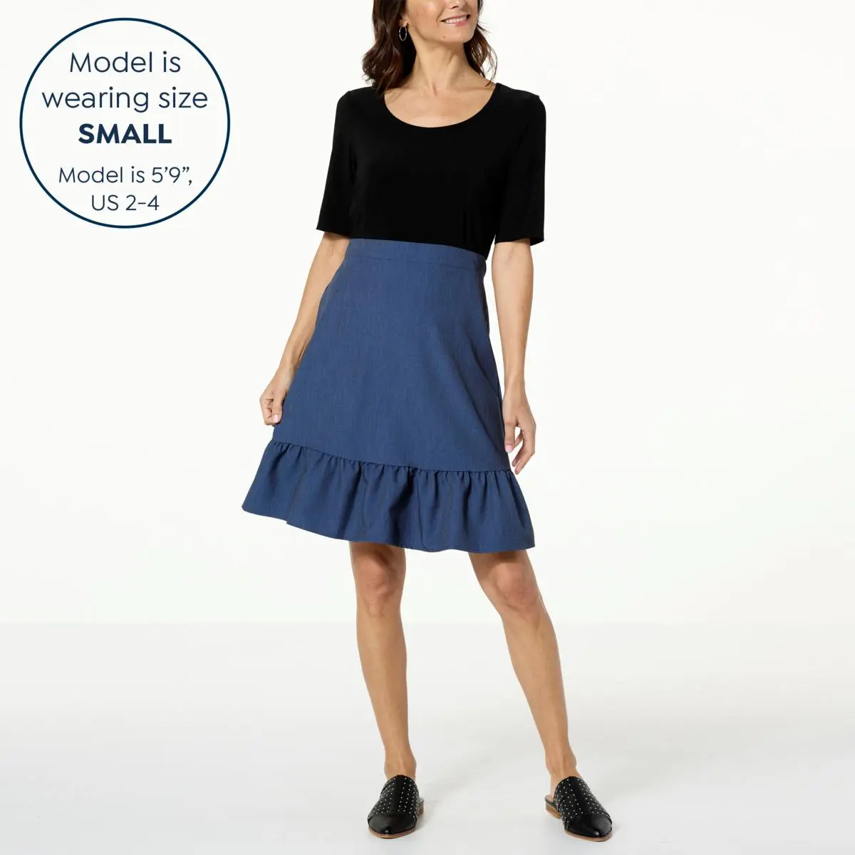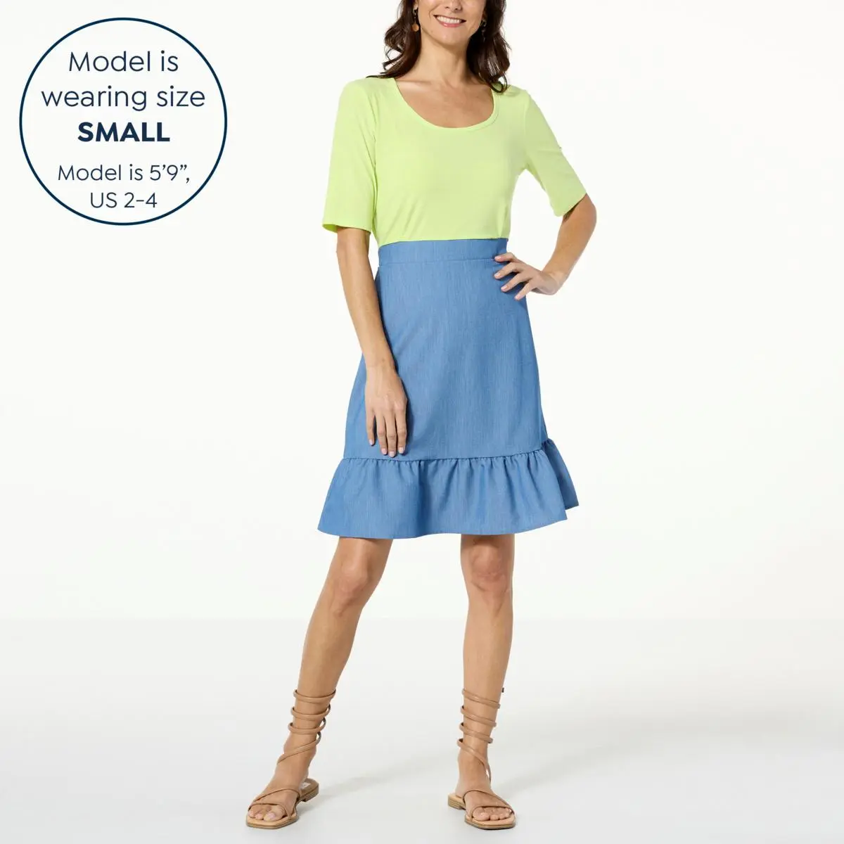 Nina Leonard Mixed Media Tiered Dress From the spring warmth to summer’s swelter, this tiered mixed media dress gives you style and versatility.