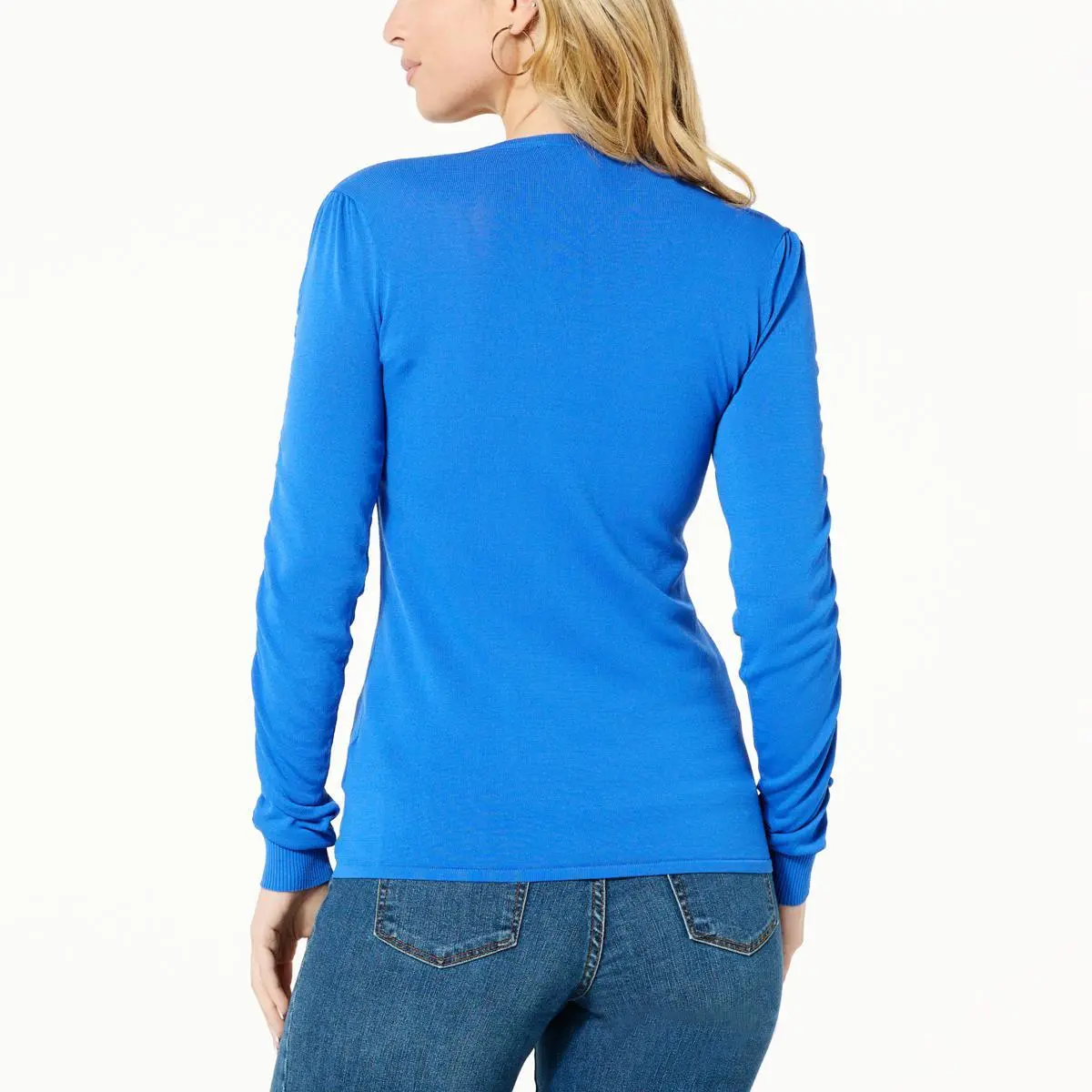 VG by Victor Glemaud Ruched V-Neck Long Sleeve Pullover Sweater Everything is more flattering with a bit of ruching. Crafted with silky-soft jersey sweater knit, it’s perfect to tuck into jeans and trousers or layer under chunky cardigans.