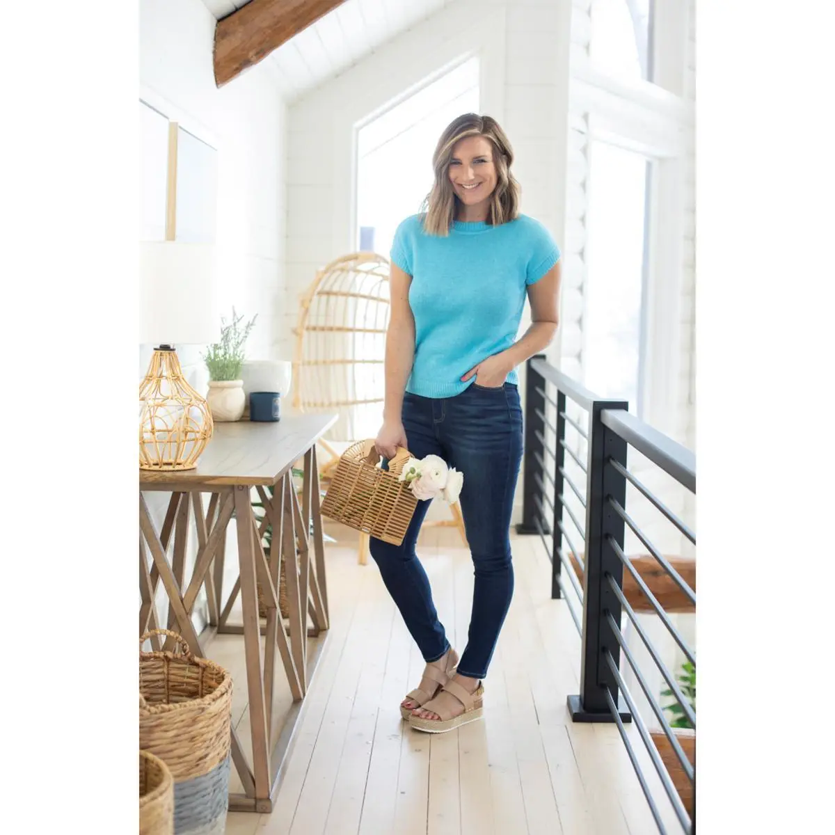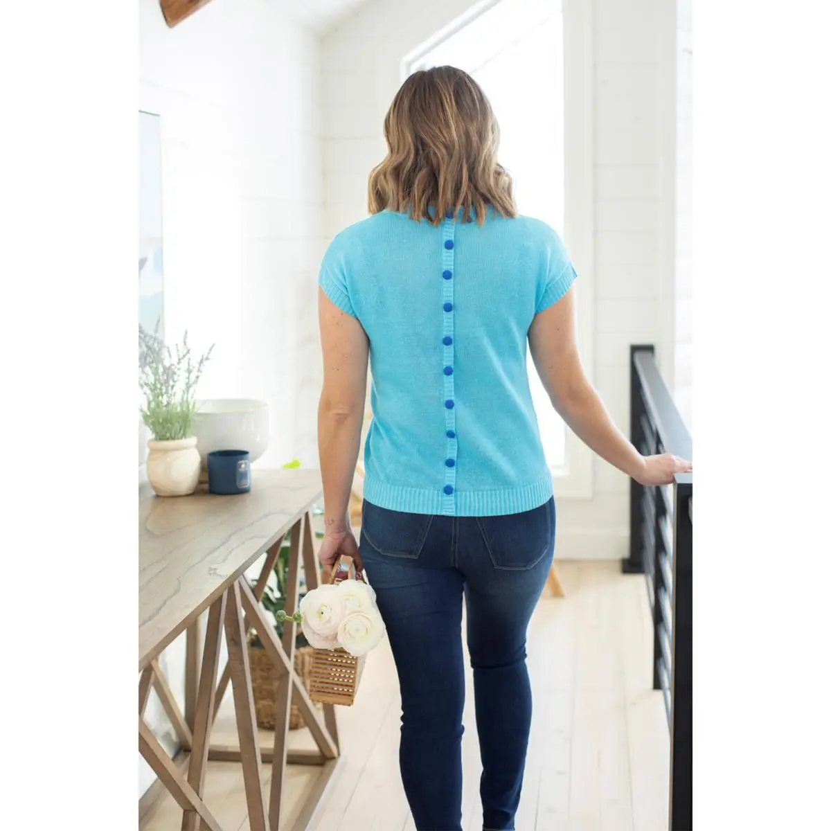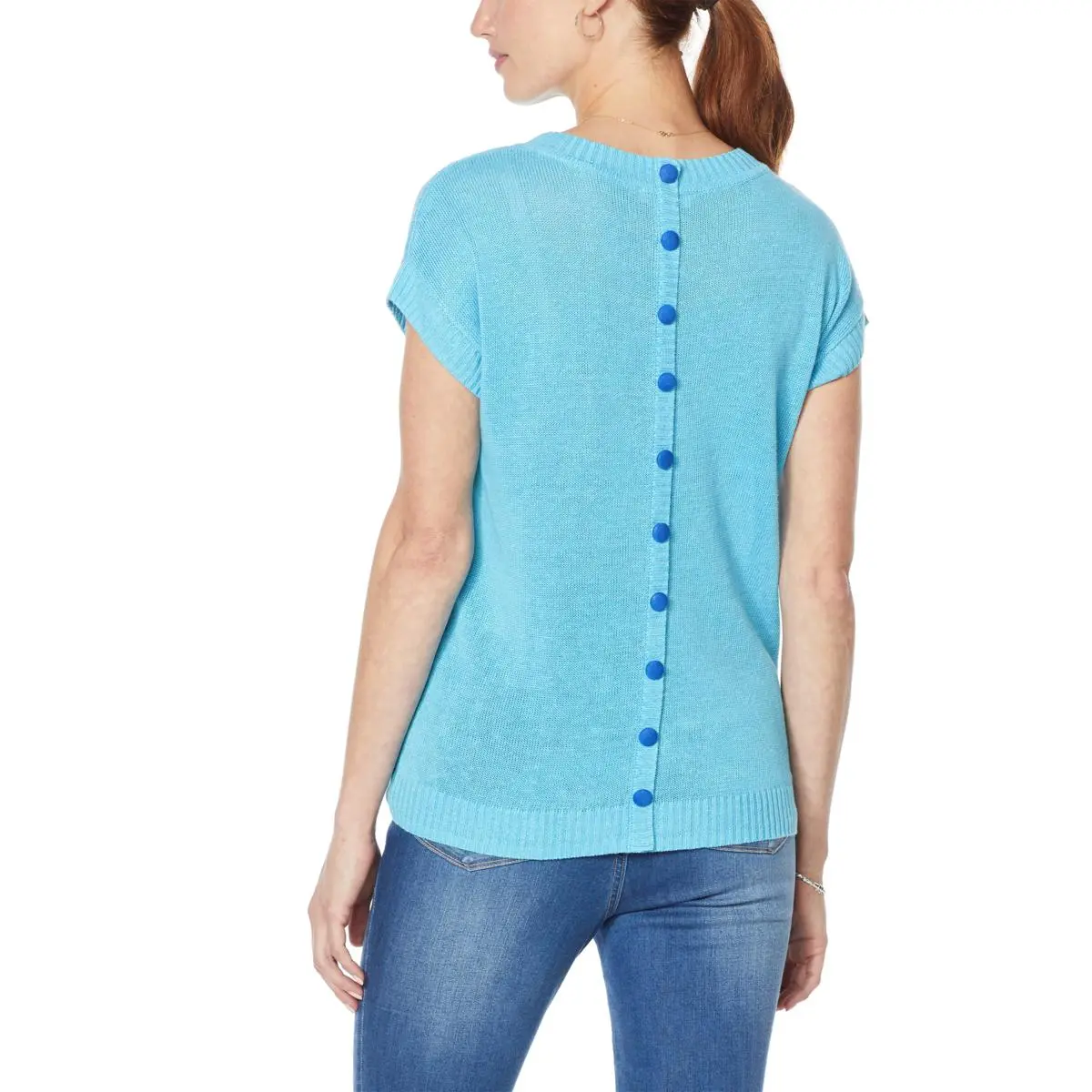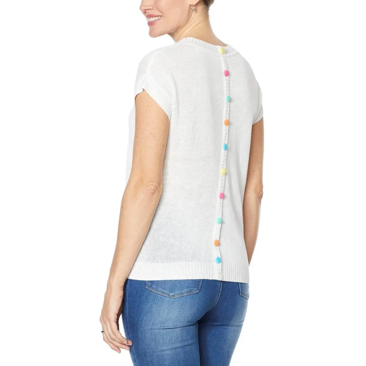WE by Living in Yellow Buttoned Back Sweater WE are living our best life in this soft linen sweater. The extended shoulder/short sleeves and multicolored back button detail create an on-trend, transitional season option for desk-to-dinner looks.
