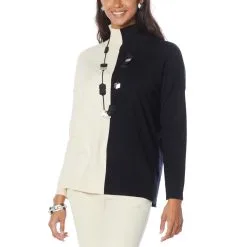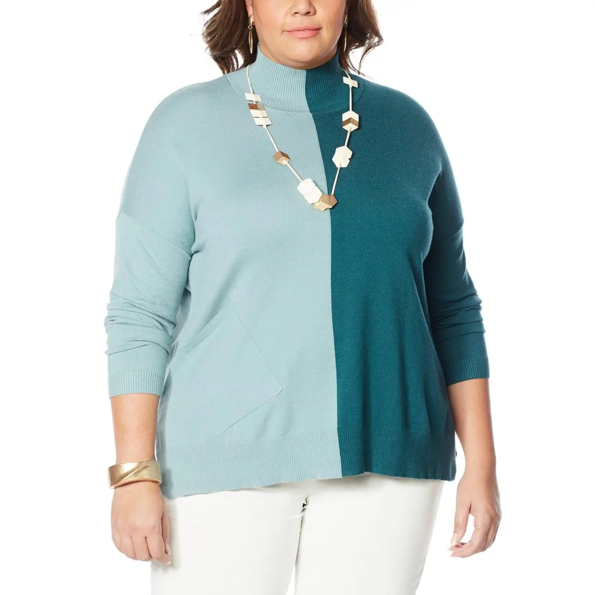 WynneLayers Colorblocked SoftKNIT Mock Neck Top Relax into the moment wearing this roomy, tri-blend knit sweater with a super-soft, lightweight hand and a bold, colorblock design that pops.